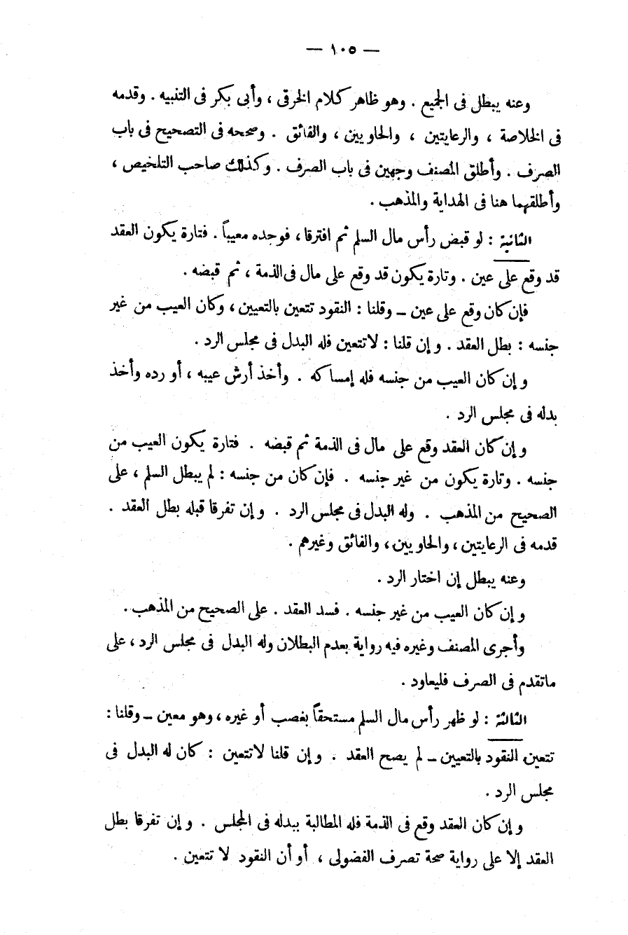 الثَّانِيَةُ: لَوْ قَبَضَ رَأْسَ مَالِ السَّلَمِ ثُمَّ افْتَرَقَا، فَوَجَدَهُ مَعِيبًا. فَتَارَةً يَكُونُ الْعَقْدُ قَدْ وَقَعَ عَلَى عَيْنٍ. وَتَارَةً يَكُونُ قَدْ وَقَعَ عَلَى مَالٍ فِي الذِّمَّةِ، ثُمَّ قَبَضَهُ. فَإِنْ كَانَ وَقَعَ عَلَى عَيْنٍ وَقُلْنَا: النُّقُودُ تَتَعَيَّنُ بِالتَّعْيِينِ، وَكَانَ الْعَيْبُ مِنْ غَيْرِ جِنْسِهِ: بَطَلَ الْعَقْدُ. وَإِنْ قُلْنَا: لَا تَتَعَيَّنُ فَلَهُ الْبَدَلُ فِي مَجْلِسِ الرَّدِّ. وَإِنْ كَانَ الْعَيْبُ مِنْ جِنْسِهِ فَلَهُ إمْسَاكُهُ. وَأَخْذُ أَرْشِ عَيْبِهِ، أَوْ رَدَّهُ وَأَخَذَ بَدَلَهُ فِي مَجْلِسِ الرَّدِّ. وَإِنْ كَانَ الْعَقْدُ وَقَعَ عَلَى مَالٍ فِي الذِّمَّةِ ثُمَّ قَبَضَهُ. فَتَارَةً يَكُونُ الْعَيْبُ مِنْ جِنْسِهِ. وَتَارَةً يَكُونُ مِنْ غَيْرِ جِنْسِهِ. فَإِنْ كَانَ مِنْ جِنْسِهِ: لَمْ يَبْطُلْ السَّلَمُ، عَلَى الصَّحِيحِ مِنْ الْمَذْهَبِ. وَلَهُ الْبَدَلُ فِي مَجْلِسِ الرَّدِّ. وَإِنْ تَفَرَّقَا قَبْلَهُ بَطَلَ الْعَقْدُ. قَدَّمَهُ فِي الرِّعَايَتَيْنِ، وَالْحَاوِيَيْنِ، وَالْفَائِقِ وَغَيْرِهِمْ. وَعَنْهُ يَبْطُلُ إنْ اخْتَارَ الرَّدَّ. وَإِنْ كَانَ الْعَيْبُ مِنْ غَيْرِ جِنْسِهِ. فَسَدَ الْعَقْدُ. عَلَى الصَّحِيحِ مِنْ الْمَذْهَبِ. وَأَجْرَى الْمُصَنِّفُ وَغَيْرُهُ فِيهِ رِوَايَةً بِعَدَمِ الْبُطْلَانِ وَلَهُ الْبَدَلُ فِي مَجْلِسِ الرَّدِّ، عَلَى مَا تَقَدَّمَ فِي الصَّرْفِ فَلْيُعَاوَدْ.