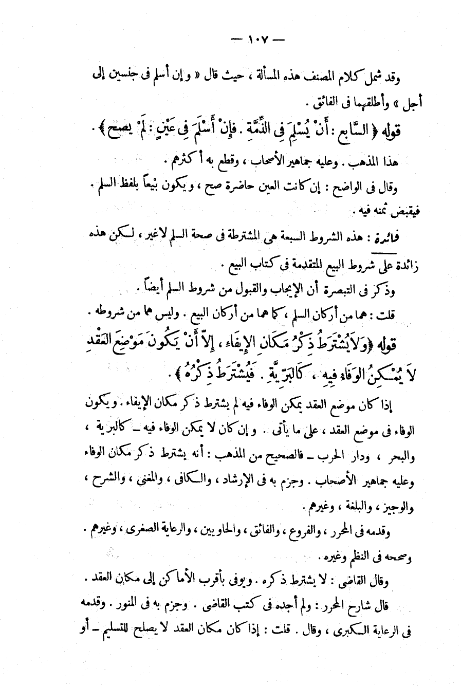 قَوْلُهُ (السَّابِعُ: أَنْ يُسْلِمَ فِي الذِّمَّةِ. فَإِنْ أَسْلَمَ فِي عَيْنٍ: لَمْ يَصِحَّ) . هَذَا الْمَذْهَبُ. وَعَلَيْهِ جَمَاهِيرُ الْأَصْحَابِ، وَقَطَعَ بِهِ أَكْثَرُهُمْ. وَقَالَ فِي الْوَاضِحِ: إنْ كَانَتْ الْعَيْنُ حَاضِرَةً صَحَّ، وَيَكُونُ بَيْعًا بِلَفْظِ السَّلَمِ. فَيُقْبَضُ ثَمَنُهُ فِيهِ.