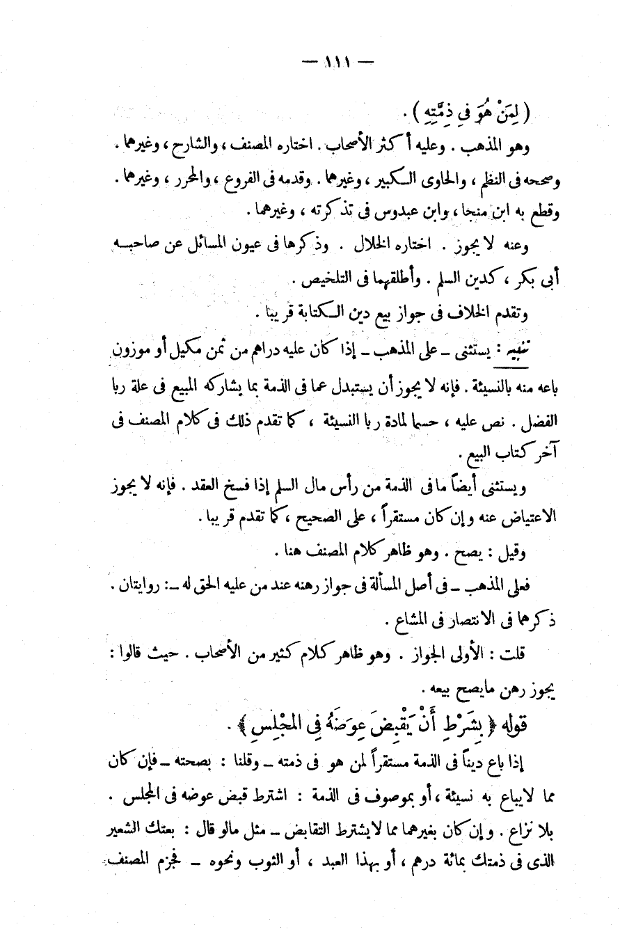 يُسْتَثْنَى عَلَى الْمَذْهَبِ إذَا كَانَ عَلَيْهِ دَرَاهِمُ مِنْ ثَمَنِ مَكِيلٍ أَوْ مَوْزُونٍ بَاعَهُ مِنْهُ بِالنَّسِيئَةِ. فَإِنَّهُ لَا يَجُوزُ أَنْ يَسْتَبْدِلَ عَمَّا فِي الذِّمَّةِ بِمَا يُشَارِكُهُ الْمَبِيعُ فِي عِلَّةِ رِبَا الْفَضْلِ. نَصَّ عَلَيْهِ، حَسْمًا لِمَادَّةِ رِبَا النَّسِيئَةِ، كَمَا تَقَدَّمَ ذَلِكَ فِي كَلَامِ الْمُصَنِّفِ فِي آخِرِ كِتَابِ الْبَيْعِ. وَيُسْتَثْنَى أَيْضًا مَا فِي الذِّمَّةِ مِنْ رَأْسِ مَالِ السَّلَمِ إذَا فُسِخَ الْعَقْدُ. فَإِنَّهُ لَا يَجُوزُ الِاعْتِيَاضُ عَنْهُ وَإِنْ كَانَ مُسْتَقِرًّا، عَلَى الصَّحِيحِ، كَمَا تَقَدَّمَ قَرِيبًا. وَقِيلَ: يَصِحُّ. وَهُوَ ظَاهِرُ كَلَامِ الْمُصَنِّفِ هُنَا. فَعَلَى الْمَذْهَبِ فِي أَصْلِ الْمَسْأَلَةِ فِي جَوَازِ رَهْنِهِ عِنْدَ مَنْ عَلَيْهِ الْحَقُّ لَهُ: رِوَايَتَانِ. ذَكَرَهُمَا فِي الِانْتِصَارِ فِي الْمَشَاعِ. قُلْت: الْأَوْلَى الْجَوَازُ. وَهُوَ ظَاهِرُ كَلَامِ كَثِيرٍ مِنْ الْأَصْحَابِ. حَيْثُ قَالُوا: يَجُوزُ رَهْنُ مَا يَصِحُّ بَيْعُهُ. قَوْلُهُ (بِشَرْطِ أَنْ يَقْبِضَ عِوَضَهُ فِي الْمَجْلِسِ) . إذَا بَاعَ دَيْنًا فِي الذِّمَّةِ مُسْتَقِرًّا لِمَنْ هُوَ فِي ذِمَّتِهِ وَقُلْنَا: بِصِحَّتِهِ فَإِنْ كَانَ مِمَّا لَا يُبَاعُ بِهِ نَسِيئَةً، أَوْ بِمَوْصُوفٍ فِي الذِّمَّةِ: اُشْتُرِطَ قَبْضُ عِوَضِهِ فِي الْمَجْلِسِ. بِلَا نِزَاعٍ. وَإِنْ كَانَ بِغَيْرِهِمَا مِمَّا لَا يُشْتَرَطُ التَّقَابُضُ مِثْلُ مَا لَوْ قَالَ: بِعْتُك الشَّعِيرَ الَّذِي فِي ذِمَّتِك بِمِائَةِ دِرْهَمٍ، أَوْ بِهَذَا الْعَبْدِ، أَوْ الثَّوْبِ وَنَحْوِهِ فَجَزَمَ الْمُصَنِّفُ