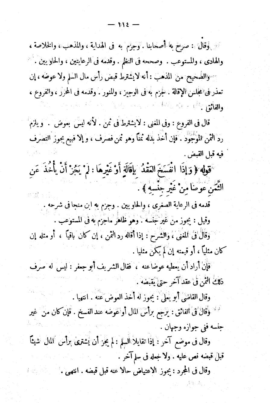 وَقَالَ: صَرَّحَ بِهِ أَصْحَابُنَا. وَجَزَمَ بِهِ فِي الْهِدَايَةِ، وَالْمُذْهَبِ، وَالْخُلَاصَةِ، وَالْهَادِي، وَالْمُسْتَوْعِبِ. وَصَحَّحَهُ فِي النَّظْمِ. وَقَدَّمَهُ فِي الرِّعَايَتَيْنِ، وَالْحَاوِيَيْنِ. وَالصَّحِيحُ مِنْ الْمَذْهَبِ: أَنَّهُ لَا يُشْتَرَطُ قَبْضُ رَأْسِ مَالِ السَّلَمِ وَلَا عِوَضِهِ، إنْ تَعَذَّرَ فِي مَجْلِسِ الْإِقَالَةِ. جَزَمَ بِهِ فِي الْوَجِيزِ، وَالْمُنَوِّرِ. وَقَدَّمَهُ فِي الْمُحَرَّرِ، وَالْفُرُوعِ، وَالْفَائِقِ. قَالَ فِي الْفُرُوعِ: وَفِي الْمُغْنِي: لَا يُشْتَرَطُ فِي ثَمَنٍ؛ لِأَنَّهُ لَيْسَ بِعِوَضٍ. وَيَلْزَمُ رَدُّ الثَّمَنِ الْمَوْجُودِ. فَإِنْ أَخَذَ بَدَلَهُ ثَمَنًا وَهُوَ ثَمَنٌ فَصَرْفٌ، وَإِلَّا فَبَيْعٌ يَجُوزُ التَّصَرُّفُ فِيهِ قَبْلَ الْقَبْضِ.