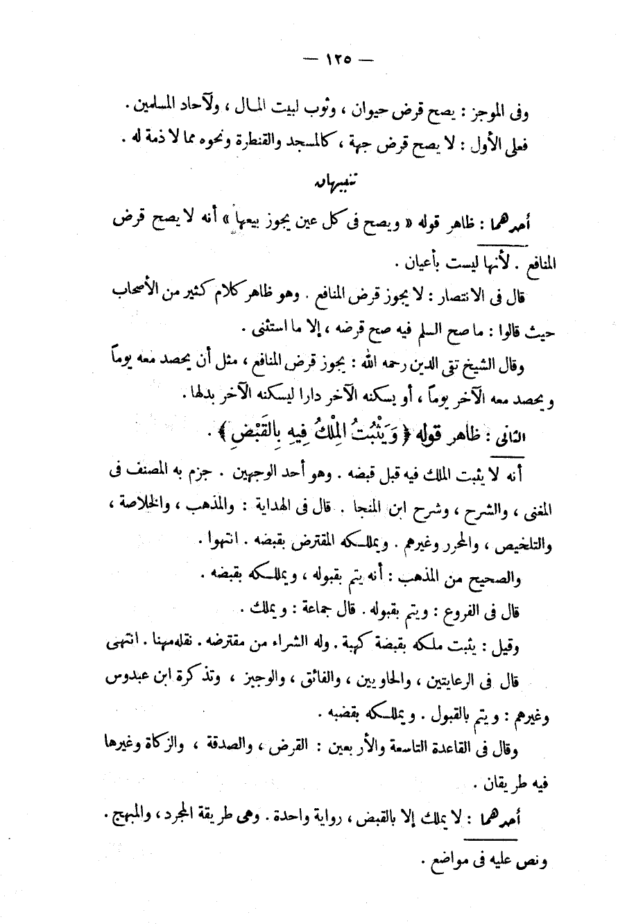 الثَّانِي: ظَاهِرُ قَوْلِهِ (وَيَثْبُتُ الْمِلْكُ فِيهِ بِالْقَبْضِ) . أَنَّهُ لَا يَثْبُتُ الْمِلْكُ فِيهِ قَبْلَ قَبْضِهِ. وَهُوَ أَحَدُ الْوَجْهَيْنِ. جَزَمَ بِهِ الْمُصَنِّفُ فِي الْمُغْنِي، وَالشَّرْحِ، وَشَرْحِ ابْنِ الْمُنَجَّى. قَالَ فِي الْهِدَايَةِ: وَالْمُذْهَبِ، وَالْخُلَاصَةِ، وَالتَّلْخِيصِ، وَالْمُحَرَّرِ وَغَيْرِهِمْ. وَيَمْلِكُهُ الْمُقْتَرِضُ بِقَبْضِهِ. انْتَهُوا. وَالصَّحِيحُ مِنْ الْمَذْهَبِ: أَنَّهُ يُتِمُّ بِقَبُولِهِ، وَيَمْلِكُهُ بِقَبْضِهِ. قَالَ فِي الْفُرُوعِ: وَيُتِمُّ بِقَبُولِهِ. قَالَ جَمَاعَةٌ: وَيَمْلِكُ. وَقِيلَ: يَثْبُتُ مِلْكُهُ بِقَبْضَةِ كَهِبَةٍ. وَلَهُ الشِّرَاءُ مِنْ مُقْتَرِضِهِ. نَقَلَهُ مُهَنَّا. انْتَهَى.
