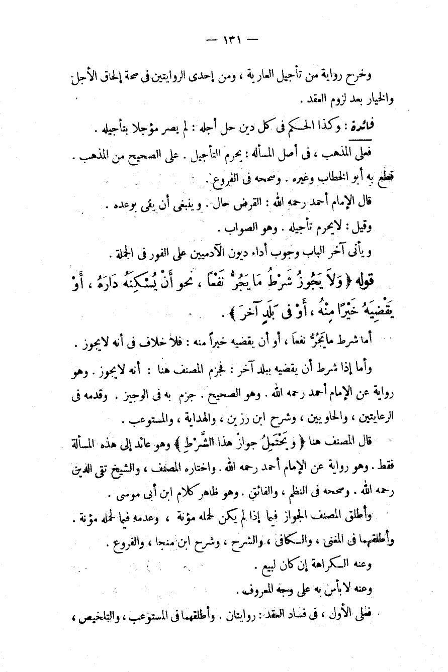 قَوْلُهُ (وَلَا يَجُوزُ شَرْطُ مَا يَجُرُّ نَفْعًا، نَحْوُ أَنْ يُسْكِنَهُ دَارِهِ، أَوْ يَقْضِيَهُ خَيْرًا مِنْهُ، أَوْ فِي بَلَدٍ آخَرَ) . أَمَّا شَرْطُ مَا يَجُرُّ نَفْعًا، أَوْ أَنْ يَقْضِيَهُ خَيْرًا مِنْهُ: فَلَا خِلَافَ فِي أَنَّهُ لَا يَجُوزُ. وَأَمَّا إذَا شَرَطَ أَنْ يَقْضِيَهُ بِبَلَدٍ آخَرَ: فَجَزَمَ الْمُصَنِّفُ هُنَا: أَنَّهُ لَا يَجُوزُ. وَهُوَ رِوَايَةٌ عَنْ الْإِمَامِ أَحْمَدَ - رَحِمَهُ اللَّهُ -. وَهُوَ الصَّحِيحُ. جَزَمَ بِهِ فِي الْوَجِيزِ. وَقَدَّمَهُ فِي الرِّعَايَتَيْنِ، وَالْحَاوِيَيْنِ، وَشَرْحِ ابْنِ رَزِينٍ، وَالْهِدَايَةِ، وَالْمُسْتَوْعِبِ. قَالَ الْمُصَنِّفُ هُنَا (وَيُحْتَمَلُ جَوَازُ هَذَا الشَّرْطِ) وَهُوَ عَائِدٌ إلَى هَذِهِ الْمَسْأَلَةِ فَقَطْ. وَهُوَ رِوَايَةٌ عَنْ الْإِمَامِ أَحْمَدَ - رَحِمَهُ اللَّهُ -. وَاخْتَارَهُ الْمُصَنِّفُ، وَالشَّيْخُ تَقِيُّ الدِّينِ - رَحِمَهُ اللَّهُ -. وَصَحَّحَهُ فِي النَّظْمِ، وَالْفَائِقِ. وَهُوَ ظَاهِرُ كَلَامِ ابْنِ أَبِي مُوسَى. وَأَطْلَقَ الْمُصَنِّفُ الْجَوَازَ فِيمَا إذَا لَمْ يَكُنْ لِحَمْلِهِ مُؤْنَةٌ، وَعَدَمَهُ فِيمَا لِحَمْلِهِ مُؤْنَةٌ. وَأَطْلَقَهُمَا فِي الْمُغْنِي، وَالْكَافِي، وَالشَّرْحِ، وَشَرْحِ ابْنِ مُنَجَّى، وَالْفُرُوعِ. وَعَنْهُ الْكَرَاهَةُ إنْ كَانَ لِبَيْعٍ. وَعَنْهُ لَا بَأْسَ بِهِ عَلَى وَجْهِ الْمَعْرُوفِ. فَعَلَى الْأَوَّلِ، فِي فَسَادِ الْعَقْدِ: رِوَايَتَانِ. وَأَطْلَقَهُمَا فِي الْمُسْتَوْعِبِ، وَالتَّلْخِيصِ،