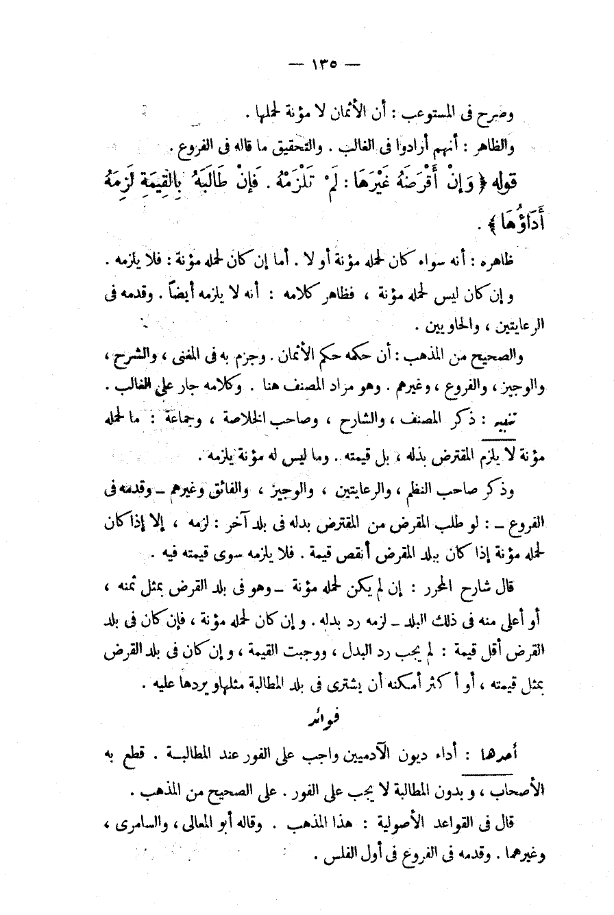وَصَرَّحَ فِي الْمُسْتَوْعِبِ: أَنَّ الْأَثْمَانَ لَا مُؤْنَةَ لِحَمْلِهَا. وَالظَّاهِرُ: أَنَّهُمْ أَرَادُوا فِي الْغَالِبِ. وَالتَّحْقِيقُ مَا قَالَهُ فِي الْفُرُوعِ. قَوْلُهُ (وَإِنْ أَقْرَضَهُ غَيْرُهَا: لَمْ تَلْزَمْهُ. فَإِنْ طَالَبَهُ بِالْقِيمَةِ لَزِمَهُ أَدَاؤُهَا) . ظَاهِرُهُ: أَنَّهُ سَوَاءٌ كَانَ لِحَمْلِهِ مُؤْنَةٌ أَوْ لَا. أَمَّا إنْ كَانَ لِحَمْلِهِ مُؤْنَةٌ: فَلَا يَلْزَمُهُ. وَإِنْ كَانَ لَيْسَ لِحَمْلِهِ مُؤْنَةٌ، فَظَاهِرُ كَلَامِهِ: أَنَّهُ لَا يَلْزَمُهُ أَيْضًا. وَقَدَّمَهُ فِي الرِّعَايَتَيْنِ، وَالْحَاوِيَيْنِ. وَالصَّحِيحُ مِنْ الْمَذْهَبِ: أَنَّ حُكْمَهُ حُكْمُ الْأَثْمَانِ. وَجَزَمَ بِهِ فِي الْمُغْنِي، وَالشَّرْحِ، وَالْوَجِيزِ، وَالْفُرُوعِ، وَغَيْرِهِمْ. وَهُوَ مُرَادُ الْمُصَنِّفِ هُنَا. وَكَلَامُهُ جَارٍ عَلَى الْغَالِبِ.