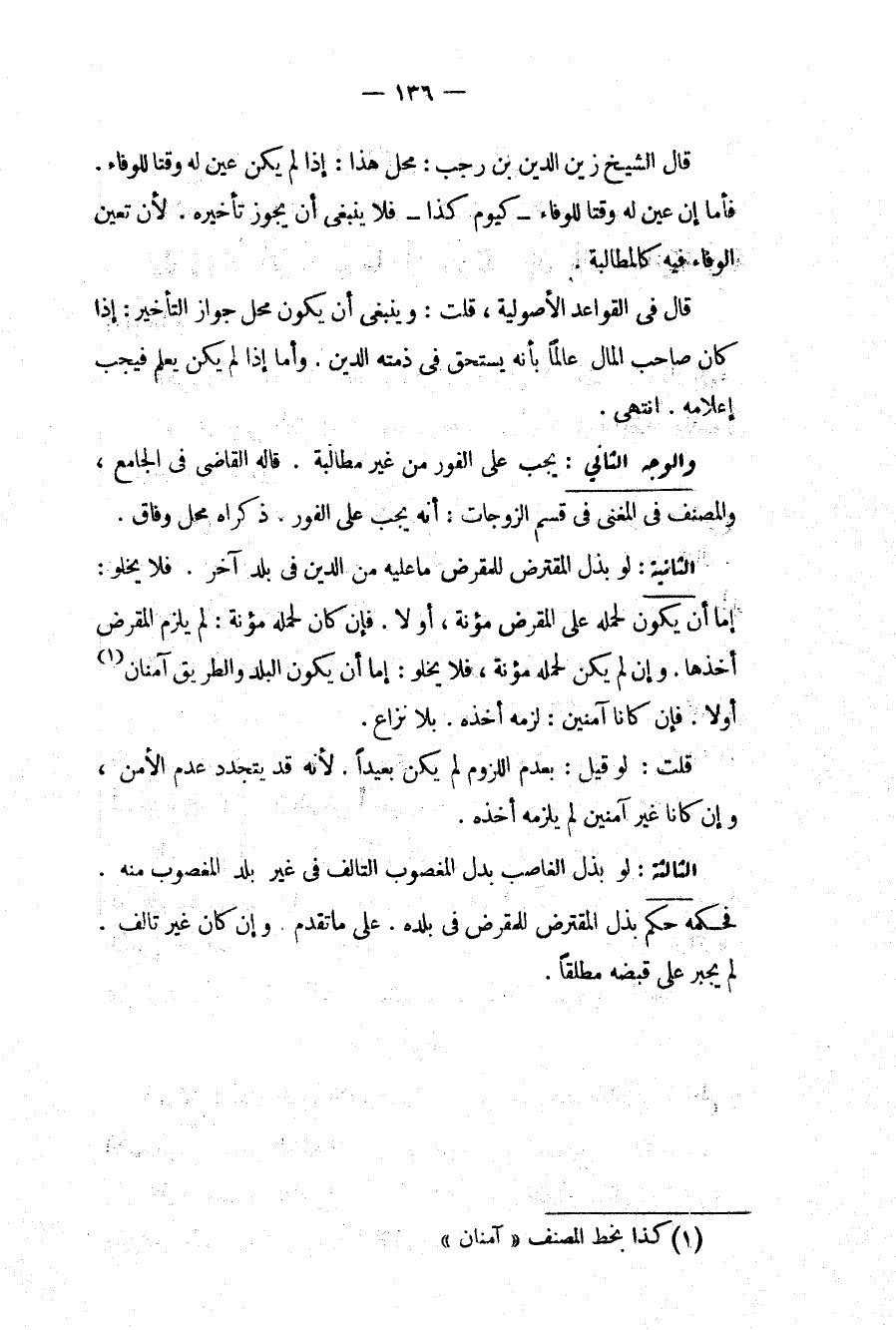 الثَّانِيَةُ: لَوْ بَذَلَ الْمُقْتَرِضُ مَا عَلَيْهِ مِنْ الدَّيْنِ فِي بَلَدٍ آخَرَ. فَلَا يَخْلُو: إمَّا أَنْ يَكُونَ لِحَمْلِهِ عَلَى الْمُقْرِضِ مُؤْنَةٌ، أَوْ لَا. فَإِنْ كَانَ لِحَمْلِهِ مُؤْنَةٌ: لَمْ يَلْزَمْ الْمُقْرِضَ أَخْذُهَا. وَإِنْ لَمْ يَكُنْ لِحَمْلِهِ مُؤْنَةٌ، فَلَا يَخْلُو: إمَّا أَنْ يَكُونَ الْبَلَدُ وَالطَّرِيقُ آمِنَانِ. أَوْ لَا. فَإِنْ كَانَا آمِنَيْنِ: لَزِمَهُ أَخْذُهُ. بِلَا نِزَاعٍ. قُلْت: لَوْ قِيلَ: بِعَدَمِ اللُّزُومِ لَمْ يَكُنْ بَعِيدًا. لِأَنَّهُ قَدْ يَتَجَدَّدُ عَدَمُ الْأَمْنِ، وَإِنْ كَانَا غَيْرَ آمِنَيْنِ لَمْ يَلْزَمْهُ أَخْذُهُ.