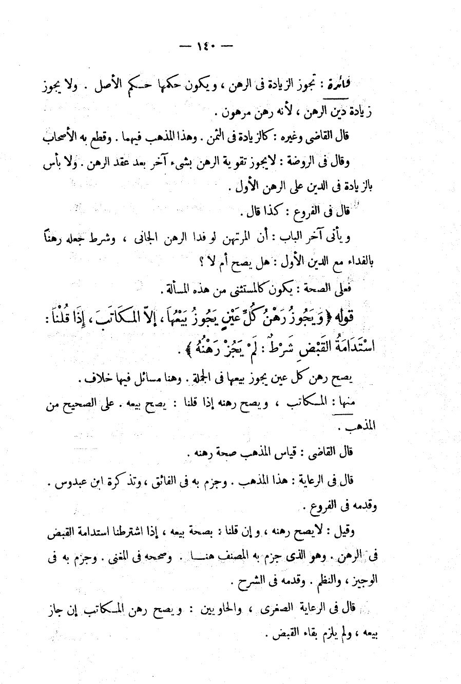 مِنْهَا: الْمُكَاتَبُ، وَيَصِحُّ رَهْنُهُ إذَا قُلْنَا: يَصِحُّ بَيْعُهُ. عَلَى الصَّحِيحِ مِنْ الْمَذْهَبِ. قَالَ الْقَاضِي: قِيَاسُ الْمَذْهَبِ صِحَّةُ رَهْنِهِ. قَالَ فِي الرِّعَايَةِ: هَذَا الْمَذْهَبُ. وَجَزَمَ بِهِ فِي الْفَائِقِ، وَتَذْكِرَةِ ابْنِ عَبْدُوسٍ. وَقَدَّمَهُ فِي الْفُرُوعِ. وَقِيلَ: لَا يَصِحُّ رَهْنُهُ، وَإِنْ قُلْنَا: بِصِحَّةِ بَيْعِهِ، إذَا اشْتَرَطْنَا اسْتِدَامَةَ الْقَبْضِ فِي الرَّهْنِ. وَهُوَ الَّذِي جَزَمَ بِهِ الْمُصَنِّفُ هُنَا. وَصَحَّحَهُ فِي الْمُغْنِي. وَجَزَمَ بِهِ فِي الْوَجِيزِ، وَالنَّظْمِ. وَقَدَّمَهُ فِي الشَّرْحِ. قَالَ فِي الرِّعَايَةِ الصُّغْرَى، وَالْحَاوِيَيْنِ: وَيَصِحُّ رَهْنُ الْمُكَاتَبِ إنْ جَازَ بَيْعُهُ، وَلَمْ يَلْزَمْ بَقَاءُ الْقَبْضِ.