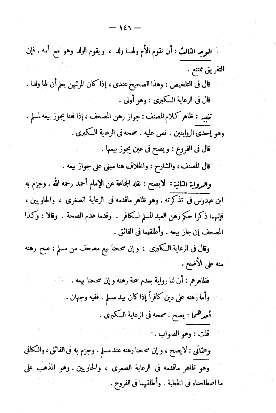 ظَاهِرُ كَلَامِ الْمُصَنِّفِ: جَوَازُ رَهْنِ الْمُصْحَفِ، إذَا قُلْنَا يَجُوزُ بَيْعُهُ لِمُسْلِمٍ. وَهُوَ إحْدَى الرِّوَايَتَيْنِ. نَصَّ عَلَيْهِ. صَحَّحَهُ فِي الرِّعَايَةِ الْكُبْرَى. قَالَ فِي الْفُرُوعِ: وَيَصِحُّ فِي عَيْنٍ يَجُوزُ بَيْعُهَا. قَالَ الْمُصَنِّفُ، وَالشَّارِحُ: وَالْخِلَافُ هُنَا مَبْنِيٌّ عَلَى جَوَازِ بَيْعِهِ. وَالرِّوَايَةُ الثَّانِيَةُ: لَا يَصِحُّ: نَقَلَهُ الْجَمَاعَةُ عَنْ الْإِمَامِ أَحْمَدَ - رَحِمَهُ اللَّهُ -. وَجَزَمَ بِهِ ابْنُ عَبْدُوسٍ فِي تَذْكِرَتِهِ. وَهُوَ ظَاهِرُ مَا قَدَّمَهُ فِي الرِّعَايَةِ الصُّغْرَى، وَالْحَاوِيَيْنِ، فَإِنَّهُمَا ذَكَرَا حُكْمَ رَهْنِ الْعَبْدِ الْمُسْلِمِ لِكَافِرٍ. وَقَدَّمَا عَدَمَ الصِّحَّةِ. وَقَالَا: وَكَذَا الْمُصْحَفُ إنْ جَازَ بَيْعُهُ. وَأَطْلَقَهُمَا فِي الْفَائِقِ. وَقَالَ فِي الرِّعَايَةِ الْكُبْرَى: وَإِنْ صَحَّحْنَا بَيْعَ مُصْحَفٍ مِنْ مُسْلِمٍ: صَحَّ رَهْنُهُ مِنْهُ عَلَى الْأَصَحِّ. فَظَاهِرُهُمْ: أَنَّ لَنَا رِوَايَةً بِعَدَمِ صِحَّةِ رَهْنِهِ وَإِنْ صَحَّحْنَا بَيْعَهُ. وَأَمَّا رَهْنُهُ عَلَى دَيْنٍ كَافِرًا إذَا كَانَ بِيَدِ مُسْلِمٍ. فَفِيهِ وَجْهَانِ.