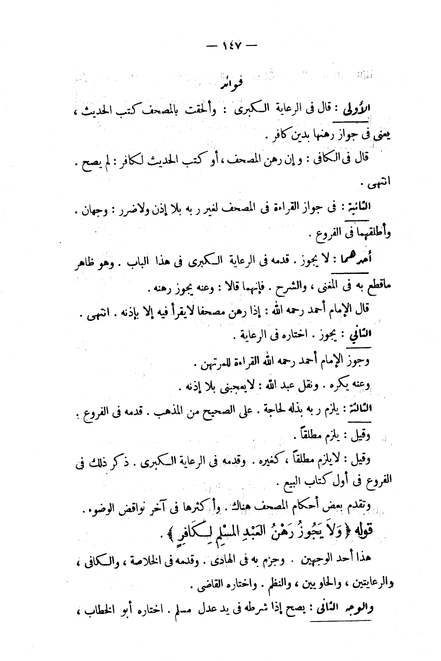 فَوَائِدُ: الْأُولَى: قَالَ فِي الرِّعَايَةِ الْكُبْرَى: وَأُلْحِقَتْ بِالْمُصْحَفِ كُتُبُ الْحَدِيثِ، يَعْنِي فِي جَوَازِ رَهْنِهَا بِدَيْنِ كَافِرٍ. قَالَ فِي الْكَافِي: وَإِنْ رَهَنَ الْمُصْحَفَ، أَوْ كُتُبَ الْحَدِيثِ لِكَافِرٍ: لَمْ يَصِحَّ. انْتَهَى.
