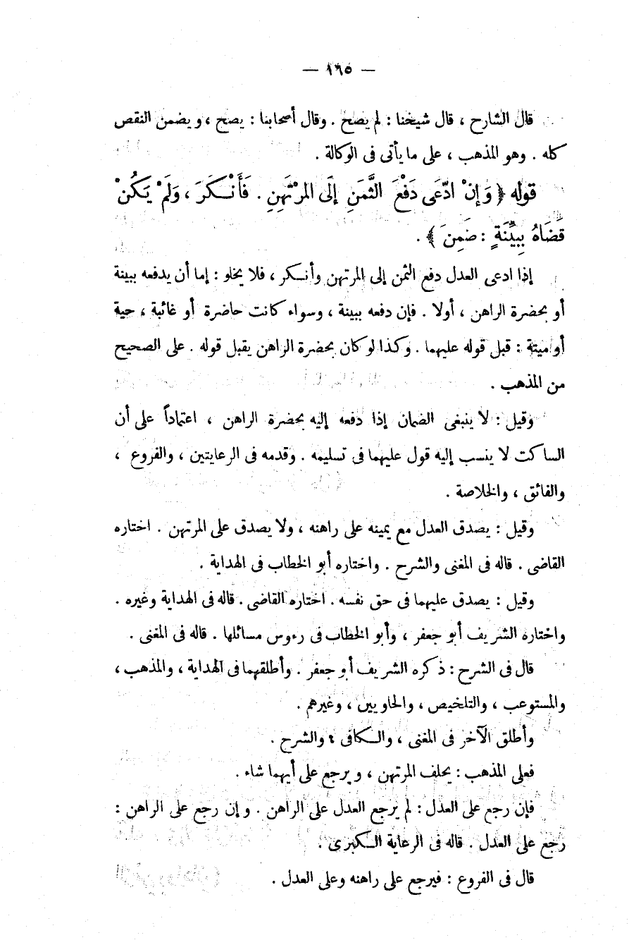 قَوْلُهُ (وَإِنْ ادَّعَى دَفْعَ الثَّمَنِ إلَى الْمُرْتَهِنِ. فَأَنْكَرَ، وَلَمْ يَكُنْ قَضَاهُ بِبَيِّنَةٍ: ضَمِنَ) . إذَا ادَّعَى الْعَدْلُ دَفْعَ الثَّمَنِ إلَى الْمُرْتَهِنِ وَأَنْكَرَ، فَلَا يَخْلُو: إمَّا أَنْ يَدْفَعَهُ بِبَيِّنَةٍ أَوْ بِحَضْرَةِ الرَّاهِنِ، أَوْ لَا. فَإِنْ دَفَعَهُ بِبَيِّنَةٍ، وَسَوَاءٌ كَانَتْ حَاضِرَةً أَوْ غَائِبَةً، حَيَّةً أَوْ مَيِّتَةً: قُبِلَ قَوْلُهُ عَلَيْهِمَا. وَكَذَا لَوْ كَانَ بِحَضْرَةِ الرَّاهِنِ يُقْبَلُ قَوْلُهُ. عَلَى الصَّحِيحِ مِنْ الْمَذْهَبِ. وَقِيلَ: لَا يَنْبَغِي الضَّمَانُ إذَا دَفَعَهُ إلَيْهِ بِحَضْرَةِ الرَّاهِنِ. اعْتِمَادًا عَلَى أَنَّ السَّاكِتَ لَا يُنْسَبُ إلَيْهِ قَوْلٌ عَلَيْهِمَا فِي تَسْلِيمِهِ. وَقَدَّمَهُ فِي الرِّعَايَتَيْنِ، وَالْفُرُوعِ، وَالْفَائِقِ، وَالْخُلَاصَةِ. وَقِيلَ: يُصَدَّقُ الْعَدْلُ مَعَ يَمِينِهِ عَلَى رَاهِنِهِ، وَلَا يُصَدَّقُ عَلَى الْمُرْتَهِنِ. اخْتَارَهُ الْقَاضِي. قَالَهُ فِي الْمُغْنِي وَالشَّرْحِ. وَاخْتَارَهُ أَبُو الْخَطَّابِ فِي الْهِدَايَةِ. وَقِيلَ: يُصَدَّقُ عَلَيْهِمَا فِي حَقِّ نَفْسِهِ. اخْتَارَهُ الْقَاضِي. قَالَهُ فِي الْهِدَايَةِ وَغَيْرِهِ. وَاخْتَارَهُ الشَّرِيفُ أَبُو جَعْفَرٍ، وَأَبُو الْخَطَّابِ فِي رُءُوسِ مَسَائِلِهَا. قَالَهُ فِي الْمُغْنِي. قَالَ فِي الشَّرْحِ: ذَكَرَهُ الشَّرِيفُ أَبُو جَعْفَرٍ. وَأَطْلَقَهُمَا فِي الْهِدَايَةِ، وَالْمُذْهَبِ، وَالْمُسْتَوْعِبِ، وَالتَّلْخِيصِ، وَالْحَاوِيَيْنِ، وَغَيْرِهِمْ. وَأَطْلَقَ الْآخَرُ فِي الْمُغْنِي، وَالْكَافِي، وَالشَّرْحِ. فَعَلَى الْمَذْهَبِ: يَحْلِفُ الْمُرْتَهِنُ، وَيَرْجِعُ عَلَى أَيِّهِمَا شَاءَ. فَإِنْ رَجَعَ عَلَى الْعَدْلِ: لَمْ يَرْجِعْ الْعَدْلُ عَلَى الرَّاهِنِ. وَإِنْ رَجَعَ عَلَى الرَّاهِنِ: رَجَعَ عَلَى الْعَدْلِ. قَالَهُ فِي الرِّعَايَةِ الْكُبْرَى. قَالَ فِي الْفُرُوعِ: فَيَرْجِعُ عَلَى رَاهِنِهِ وَعَلَى الْعَدْلِ.