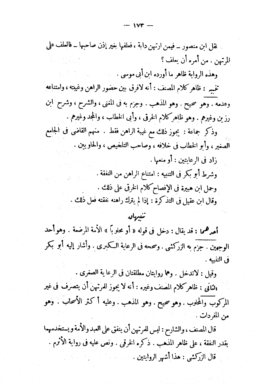 نَقَلَ ابْنُ مَنْصُورٍ فِيمَنْ ارْتَهَنَ دَابَّةً، فَعَلَفَهَا بِغَيْرِ إذْنِ صَاحِبِهَا فَالْعَلَفُ عَلَى الْمُرْتَهِنِ. مَنْ أَمَرَهُ أَنْ يَعْلِفَ؟ وَهَذِهِ الرِّوَايَةُ ظَاهِرُ مَا أَوْرَدَهُ ابْنُ أَبِي مُوسَى.