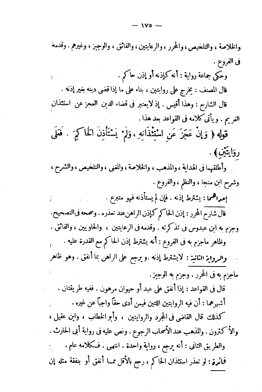 وَالْخُلَاصَةِ، وَالتَّلْخِيصِ، وَالْمُحَرَّرِ، وَالرِّعَايَتَيْنِ، وَالْفَائِقِ، وَالْوَجِيزِ، وَغَيْرِهِمْ. وَقَدَّمَهُ فِي الْفُرُوعِ. وَحَكَى جَمَاعَةٌ رِوَايَةً: أَنَّهُ كَإِذْنِهِ أَوْ إذْنِ حَاكِمٍ. قَالَ الْمُصَنِّفُ: يُخَرَّجُ عَلَى رِوَايَتَيْنِ، بِنَاءً عَلَى مَا إذَا قَضَى دَيْنَهُ بِغَيْرِ إذْنِهِ. قَالَ الشَّارِحُ: وَهَذَا أَقْيَسُ. إذْ لَا يُعْتَبَرُ فِي قَضَاءِ الدَّيْنِ الْعَجْزُ عَنْ اسْتِئْذَانِ الْغَرِيمِ. وَيَأْتِي كَلَامُهُ فِي الْقَوَاعِدِ بَعْدَ هَذَا. قَوْلُهُ (وَإِنْ عَجَزَ عَنْ اسْتِئْذَانِهِ، وَلَمْ يَسْتَأْذِنْ الْحَاكِمَ. فَعَلَى رِوَايَتَيْنِ) . وَأَطْلَقَهُمَا فِي الْهِدَايَةِ. وَالْمُذْهَبِ، وَالْخُلَاصَةِ، وَالْمُغْنِي، وَالتَّلْخِيصِ، وَالشَّرْحِ، وَشَرْحِ ابْنِ مُنَجَّى، وَالنَّظْمِ، وَالْفُرُوعِ.