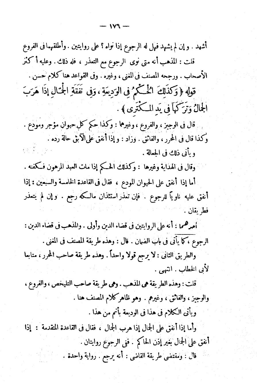 قُلْت: وَهَذِهِ الطَّرِيقَةُ هِيَ الْمَذْهَبُ. وَهِيَ طَرِيقَةُ صَاحِبِ التَّلْخِيصِ، وَالْفُرُوعِ، وَالْوَجِيزِ، وَالْفَائِقِ، وَغَيْرِهِمْ. وَهُوَ ظَاهِرُ كَلَامِ الْمُصَنِّفِ هُنَا. وَيَأْتِي الْكَلَامُ فِي هَذَا فِي الْوَدِيعَةِ بِأَتَمَّ مِنْ هَذَا. وَأَمَّا إذَا أَنْفَقَ عَلَى الْجِمَالِ إذَا هَرَبَ الْجَمَّالُ، فَقَالَ فِي الْقَاعِدَةِ الْمُتَقَدِّمَةِ: إذَا أَنْفَقَ عَلَى الْجِمَالِ بِغَيْرِ إذْنِ الْحَاكِمِ. فَفِي الرُّجُوعِ رِوَايَتَانِ. قَالَ: وَمُقْتَضَى طَرِيقَةِ الْقَاضِي: أَنَّهُ يَرْجِعُ. رِوَايَةً وَاحِدَةً.