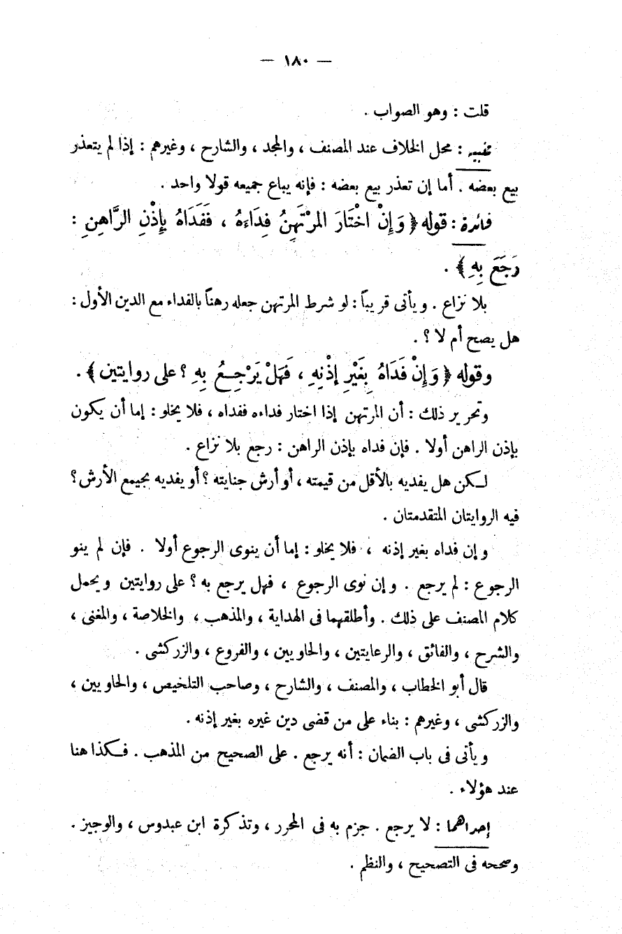 فَائِدَةٌ: قَوْلُهُ (وَإِنْ اخْتَارَ الْمُرْتَهِنُ فِدَاءَهُ، فَفَدَاهُ بِإِذْنِ الرَّاهِنِ: رَجَعَ بِهِ) . بِلَا نِزَاعٍ. وَيَأْتِي قَرِيبًا: لَوْ شَرَطَ الْمُرْتَهِنُ جَعْلَهُ رَهْنًا بِالْفِدَاءِ مَعَ الدَّيْنِ الْأَوَّلِ: هَلْ يَصْلُحُ أَمْ لَا؟ وَقَوْلُهُ (وَإِنْ فَدَاهُ بِغَيْرِ إذْنِهِ، فَهَلْ يَرْجِعُ بِهِ؟ عَلَى رِوَايَتَيْنِ) . وَتَحْرِيرُ ذَلِكَ: أَنَّ الْمُرْتَهِنَ إذَا اخْتَارَ فِدَاءَهُ فَفَدَاهُ، فَلَا يَخْلُو: إمَّا أَنْ يَكُونَ بِإِذْنِ الرَّاهِنِ أَوْ لَا. فَإِنْ فَدَاهُ بِإِذْنِ الرَّاهِنِ: رَجَعَ بِلَا نِزَاعٍ. لَكِنْ هَلْ يَفْدِيهِ بِالْأَقَلِّ مِنْ قِيمَتِهِ، أَوْ أَرْشِ جِنَايَتِهِ؟ أَوْ يَفْدِيهِ بِجَمِيعِ الْأَرْشِ؟ فِيهِ الرِّوَايَتَانِ الْمُتَقَدِّمَتَانِ. وَإِنْ فَدَاهُ بِغَيْرِ إذْنِهِ، فَلَا يَخْلُو: إمَّا أَنْ يَنْوِيَ الرُّجُوعَ أَوْ لَا. فَإِنْ لَمْ يَنْوِ الرُّجُوعَ: لَمْ يَرْجِعْ. وَإِنْ نَوَى الرُّجُوعَ، فَهَلْ يَرْجِعُ بِهِ؟ عَلَى رِوَايَتَيْنِ وَيُحْمَلُ كَلَامُ الْمُصَنِّفِ عَلَى ذَلِكَ. وَأَطْلَقَهُمَا فِي الْهِدَايَةِ، وَالْمُذْهَبِ، وَالْخُلَاصَةِ، وَالْمُغْنِي، وَالشَّرْحِ، وَالْفَائِقِ، وَالرِّعَايَتَيْنِ، وَالْحَاوِيَيْنِ، وَالْفُرُوعِ، وَالزَّرْكَشِيِّ. قَالَ أَبُو الْخَطَّابِ، وَالْمُصَنِّفُ، وَالشَّارِحُ، وَصَاحِبُ التَّلْخِيصِ، وَالْحَاوِيَيْنِ، وَالزَّرْكَشِيُّ، وَغَيْرُهُمْ: بِنَاءً عَلَى مَنْ قَضَى دَيْنَ غَيْرِهِ بِغَيْرِ إذْنِهِ. وَيَأْتِي فِي بَابِ الضَّمَانِ: أَنَّهُ يَرْجِعُ. عَلَى الصَّحِيحِ مِنْ الْمَذْهَبِ. فَكَذَا هُنَا عِنْدَ هَؤُلَاءِ.