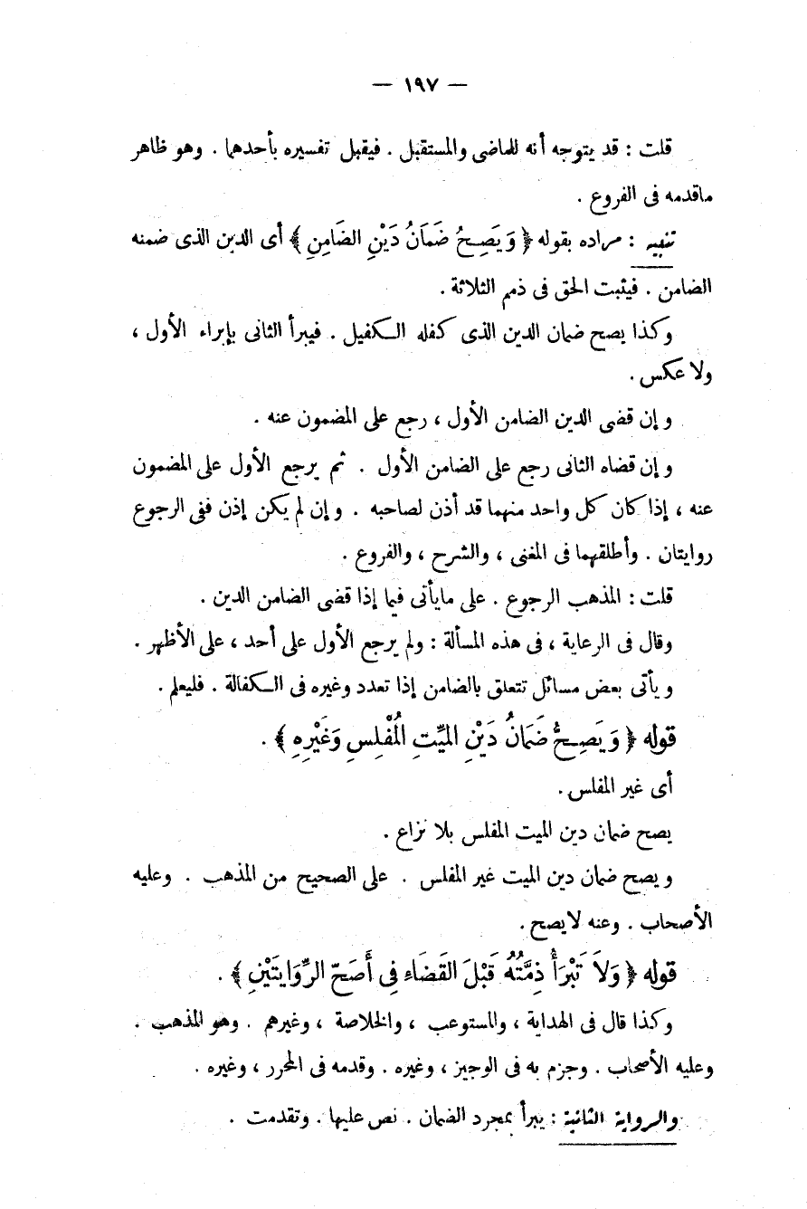 قَوْلُهُ (وَيَصِحُّ ضَمَانُ دَيْنِ الْمَيِّتِ الْمُفْلِسِ وَغَيْرِهِ) . أَيْ غَيْرِ الْمُفْلِسِ. يَصِحُّ ضَمَانُ دَيْنِ الْمَيِّتِ الْمُفْلِسِ بِلَا نِزَاعٍ. وَيَصِحُّ ضَمَانُ دَيْنِ الْمَيِّتِ غَيْرِ الْمُفْلِسِ. عَلَى الصَّحِيحِ مِنْ الْمَذْهَبِ. وَعَلَيْهِ الْأَصْحَابُ. وَعَنْهُ لَا يَصِحُّ. قَوْلُهُ (وَلَا تَبْرَأُ ذِمَّتُهُ قَبْلَ الْقَضَاءِ فِي أَصَحِّ الرِّوَايَتَيْنِ) . وَكَذَا قَالَ فِي الْهِدَايَةِ، وَالْمُسْتَوْعِبِ، وَالْخُلَاصَةِ، وَغَيْرِهِمْ. وَهُوَ الْمَذْهَبُ وَعَلَيْهِ الْأَصْحَابُ. وَجَزَمَ بِهِ فِي الْوَجِيزِ، وَغَيْرِهِ. وَقَدَّمَهُ فِي الْمُحَرَّرِ، وَغَيْرِهِ. وَالرِّوَايَةُ الثَّانِيَةُ: يَبْرَأُ بِمُجَرَّدِ الضَّمَانِ. نَصَّ عَلَيْهَا. وَتَقَدَّمَتْ.