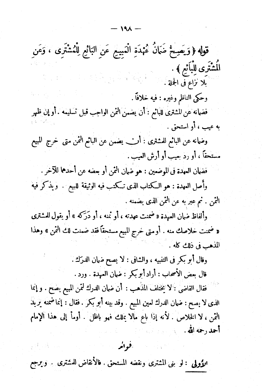 قَوْلُهُ (وَيَصِحُّ ضَمَانُ عُهْدَةِ الْمَبِيعِ عَنْ الْبَائِعِ لِلْمُشْتَرِي، وَعَنْ الْمُشْتَرِي لِلْبَائِعِ) . بِلَا نِزَاعٍ فِي الْجُمْلَةِ. وَحَكَى النَّاظِمُ وَغَيْرُهُ: فِيهِ خِلَافًا. فَضَمَانُهُ عَنْ الْمُشْتَرِي لِلْبَائِعِ: أَنْ يَضْمَنَ الثَّمَنَ الْوَاجِبَ قَبْلَ تَسْلِيمِهِ. أَوْ إنْ ظَهَرَ بِهِ عَيْبٌ، أَوْ اسْتَحَقَّ. وَضَمَانُهُ عَنْ الْبَائِعِ لِلْمُشْتَرِي: أَنْ يَضْمَنَ عَنْ الْبَائِعِ الثَّمَنَ مَتَى خَرَجَ الْمَبِيعُ مُسْتَحَقًّا، أَوْ رُدَّ بِعَيْبٍ أَوْ أَرْشِ الْعَيْبِ. فَضَمَانُ الْعُهْدَةِ فِي الْمَوْضِعَيْنِ: هُوَ ضَمَانُ الثَّمَنِ أَوْ بَعْضِهِ عَنْ أَحَدِهِمَا لِلْآخَرِ. وَأَصْلُ الْعُهْدَةِ: هُوَ الْكِتَابُ الَّذِي تُكْتَبُ فِيهِ الْوَثِيقَةُ لِلْبَيْعِ. وَيُذْكَرُ فِيهِ الثَّمَنُ. ثُمَّ عَبَّرَ بِهِ عَنْ الثَّمَنِ الَّذِي يَضْمَنُهُ. وَأَلْفَاظُ ضَمَانِ الْعُهْدَةِ " ضَمِنْت عُهْدَتَهُ، أَوْ ثَمَنَهُ، أَوْ دَرَكَهُ " أَوْ يَقُولُ لِلْمُشْتَرِي " ضَمِنْت خَلَاصَك مِنْهُ. أَوْ مَتَى خَرَجَ الْمَبِيعُ مُسْتَحَقًّا فَقَدْ ضَمِنْت لَك الثَّمَنَ " وَهَذَا الْمَذْهَبُ فِي ذَلِكَ كُلِّهِ. وَقَالَ أَبُو بَكْرٍ فِي التَّنْبِيهِ، وَالشَّافِي: لَا يَصِحُّ ضَمَانُ الدَّرَكِ. قَالَ بَعْضُ الْأَصْحَابِ: أَرَادَ أَبُو بَكْرٍ: ضَمَانَ الْعُهْدَةِ. وَرُدَّ. فَقَالَ الْقَاضِي: لَا يَخْتَلِفُ الْمَذْهَبُ: أَنَّ ضَمَانَ الدَّرَكِ لِثَمَنِ الْمَبِيعِ يَصِحُّ. وَإِنَّمَا الَّذِي لَا يَصِحُّ: ضَمَانُ الدَّرَكِ لِعَيْنِ الْمَبِيعِ. وَقَدْ بَيَّنَهُ أَبُو بَكْرٍ. فَقَالَ: إنَّمَا ضَمِنَهُ يُرِيدُ الثَّمَنَ، لَا الْخَلَاصَ. لِأَنَّهُ إذَا بَاعَ مَا لَا يَمْلِكُ فَهُوَ بَاطِلٌ. أَوْمَأَ إلَى هَذَا الْإِمَامُ أَحْمَدُ - رَحِمَهُ اللَّهُ -.