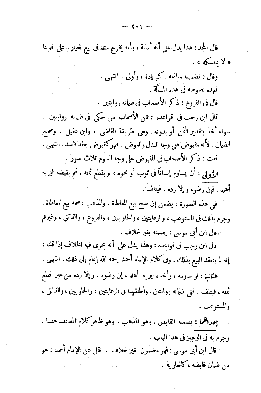 فَهَذِهِ نُصُوصُهُ فِي هَذِهِ الْمَسْأَلَةِ. قَالَ فِي الْفُرُوعِ: ذَكَرَ الْأَصْحَابُ فِي ضَمَانِهِ رِوَايَتَيْنِ. قَالَ ابْنُ رَجَبٍ فِي قَوَاعِدِهِ: فَمِنْ الْأَصْحَابِ مَنْ حَكَى فِي ضَمَانِهِ رِوَايَتَيْنِ. سَوَاءٌ أَخَذَ بِتَقْدِيرِ الثَّمَنِ أَوْ بِدُونِهِ. وَهِيَ طَرِيقَةُ الْقَاضِي، وَابْنِ عَقِيلٍ. وَصَحَّحَ الضَّمَانَ. لِأَنَّهُ مَقْبُوضٌ عَلَى وَجْهِ الْبَدَلِ وَالْعِوَضِ. فَهُوَ كَمَقْبُوضٍ بِعَقْدٍ فَاسِدٍ. انْتَهَى.