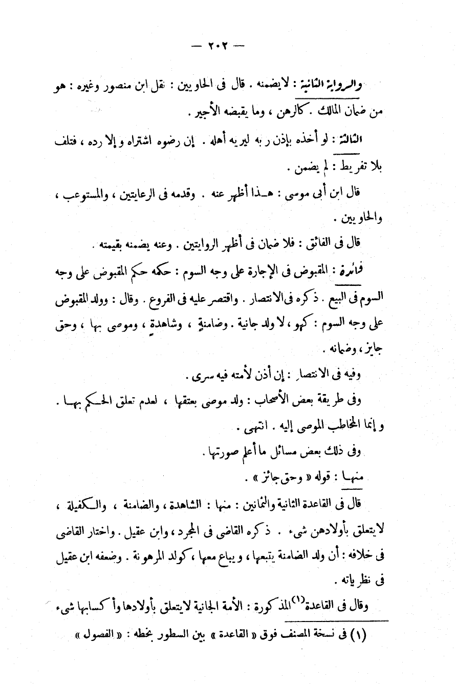 وَفِي ذَلِكَ بَعْضُ مَسَائِلَ مَا أَعْلَمُ صُورَتَهَا. مِنْهَا: قَوْلُهُ " وَحَقٍّ جَائِزٍ ". قَالَ فِي الْقَاعِدَةِ الثَّانِيَةِ وَالثَّمَانِينَ: مِنْهَا: الشَّاهِدَةُ، وَالضَّامِنَةُ، وَالْكَفِيلَةُ، لَا يَتَعَلَّقُ بِأَوْلَادِهِنَّ شَيْءٌ. ذَكَرَهُ الْقَاضِي فِي الْمُجَرَّدِ، وَابْنُ عَقِيلٍ. وَاخْتَارَهُ الْقَاضِي فِي خِلَافِهِ: أَنَّ وَلَدَ الضَّامِنَةِ يَتْبَعُهَا، وَيُبَاعُ مَعَهَا كَوَلَدِ الْمَرْهُونَةِ. وَضَعَّفَهُ ابْنُ عَقِيلٍ فِي نَظَرِيَّاتِهِ. وَقَالَ فِي الْقَاعِدَةِ الْمَذْكُورَةِ: الْأَمَةُ الْجَانِيَةُ لَا يَتَعَلَّقُ بِأَوْلَادِهَا وَأَكْسَابِهَا شَيْءٌ