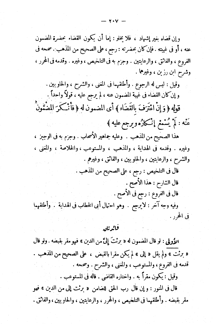 قَوْلُهُ (وَإِنْ اعْتَرَفَ بِالْقَضَاءِ) أَيْ الْمَضْمُونُ لَهُ (فَأَنْكَرَ الْمَضْمُونُ عَنْهُ: لَمْ يُسْمَعْ إنْكَارُهُ وَيَرْجِعُ عَلَيْهِ) . هَذَا الصَّحِيحُ مِنْ الْمَذْهَبِ. وَعَلَيْهِ جَمَاهِيرُ الْأَصْحَابِ. وَجَزَمَ بِهِ فِي الْوَجِيزِ، وَغَيْرِهِ. وَقَدَّمَهُ فِي الْهِدَايَةِ، وَالْمُذْهَبِ، وَالْمُسْتَوْعِبِ، وَالْخُلَاصَةِ، وَالْمُغْنِي، وَالشَّرْحِ، وَالرِّعَايَتَيْنِ، وَالْحَاوِيَيْنِ، وَالْفَائِق، وَغَيْرِهِمْ. قَالَ فِي التَّلْخِيصِ: رَجَعَ، عَلَى الصَّحِيحِ مِنْ الْمَذْهَبِ. قَالَ الشَّارِحُ: هَذَا الْأَصَحُّ. قَالَ فِي الْفُرُوعِ: رَجَعَ فِي الْأَصَحِّ. وَفِيهِ وَجْهٌ آخَرُ: لَا يَرْجِعُ. وَهُوَ احْتِمَالُ أَبِي الْخَطَّابِ فِي الْهِدَايَةِ. وَأَطْلَقَهُمَا فِي الْمُحَرَّرِ.