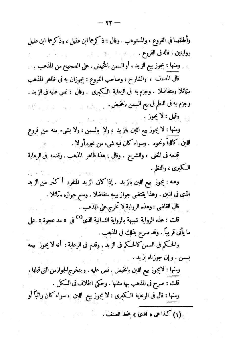 وَمِنْهَا: لَا يَجُوزُ بَيْعُ اللَّبَنِ بِالزُّبْدِ، وَلَا بِالسَّمْنِ، وَلَا بِشَيْءٍ مِنْهُ مِنْ فُرُوعِ اللَّبَنِ. كَاللِّبَأِ وَنَحْوِهِ. وَسَوَاءٌ كَانَ فِيهِ شَيْءٌ مِنْ غَيْرِهِ أَوْ لَا. قَدَّمَهُ فِي الْمُغْنِي، وَالشَّرْحِ وَقَالَ: هَذَا ظَاهِرُ الْمَذْهَبِ وَقَدَّمَهُ فِي الرِّعَايَةِ الْكُبْرَى، وَالنَّظْمِ. وَعَنْهُ: يَجُوزُ بَيْعُ اللَّبَنِ بِالزُّبْدِ. إذَا كَانَ الزُّبْدُ الْمُنْفَرِدُ أَكْثَرَ مِنْ الزُّبْدِ الَّذِي فِي اللَّبَنِ. وَهَذَا يَقْتَضِي جَوَازَ بَيْعِهِ مُتَفَاضِلًا. وَمَنْعَ جَوَازِهِ مُتَمَاثِلًا. قَالَ الْقَاضِي: وَهَذِهِ الرِّوَايَةُ لَا تَخْرُجُ عَلَى الْمَذْهَبِ قُلْت: هَذِهِ الرِّوَايَةُ شَبِيهَةٌ بِالرِّوَايَةِ الثَّانِيَةِ الَّذِي فِي " مُدِّ عَجْوَةٍ " عَلَى مَا يَأْتِي قَرِيبًا. وَقَدْ صَرَّحَ بِذَلِكَ فِي الْمُذْهَبِ وَالْحُكْمُ فِي السَّمْنِ كَالْحُكْمِ فِي الزُّبْدِ. وَقَدَّمَ فِي الرِّعَايَةِ: أَنَّهُ لَا يَجُوزُ بَيْعُهُ بِسَمْنٍ. وَإِنْ جَوَّزْنَاهُ بِزُبْدٍ.