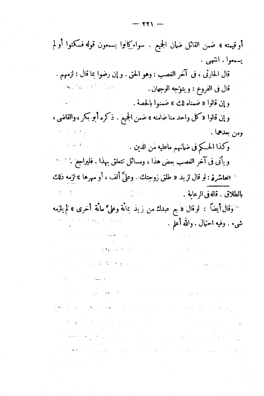 الْعَاشِرَةُ: لَوْ قَالَ لِزَيْدٍ " طَلِّقْ زَوْجَتَك. وَعَلَيَّ أَلْفٌ، أَوْ مَهْرُهَا " لَزِمَهُ ذَلِكَ بِالطَّلَاقِ. قَالَهُ فِي الرِّعَايَةِ. وَقَالَ أَيْضًا: لَوْ قَالَ " بِعْ عَبْدَك مِنْ زَيْدٍ بِمِائَةٍ وَعَلَيَّ مِائَةٌ أُخْرَى " لَمْ يَلْزَمْهُ شَيْءٌ. وَفِيهِ احْتِمَالٌ. وَاَللَّهُ أَعْلَمُ.