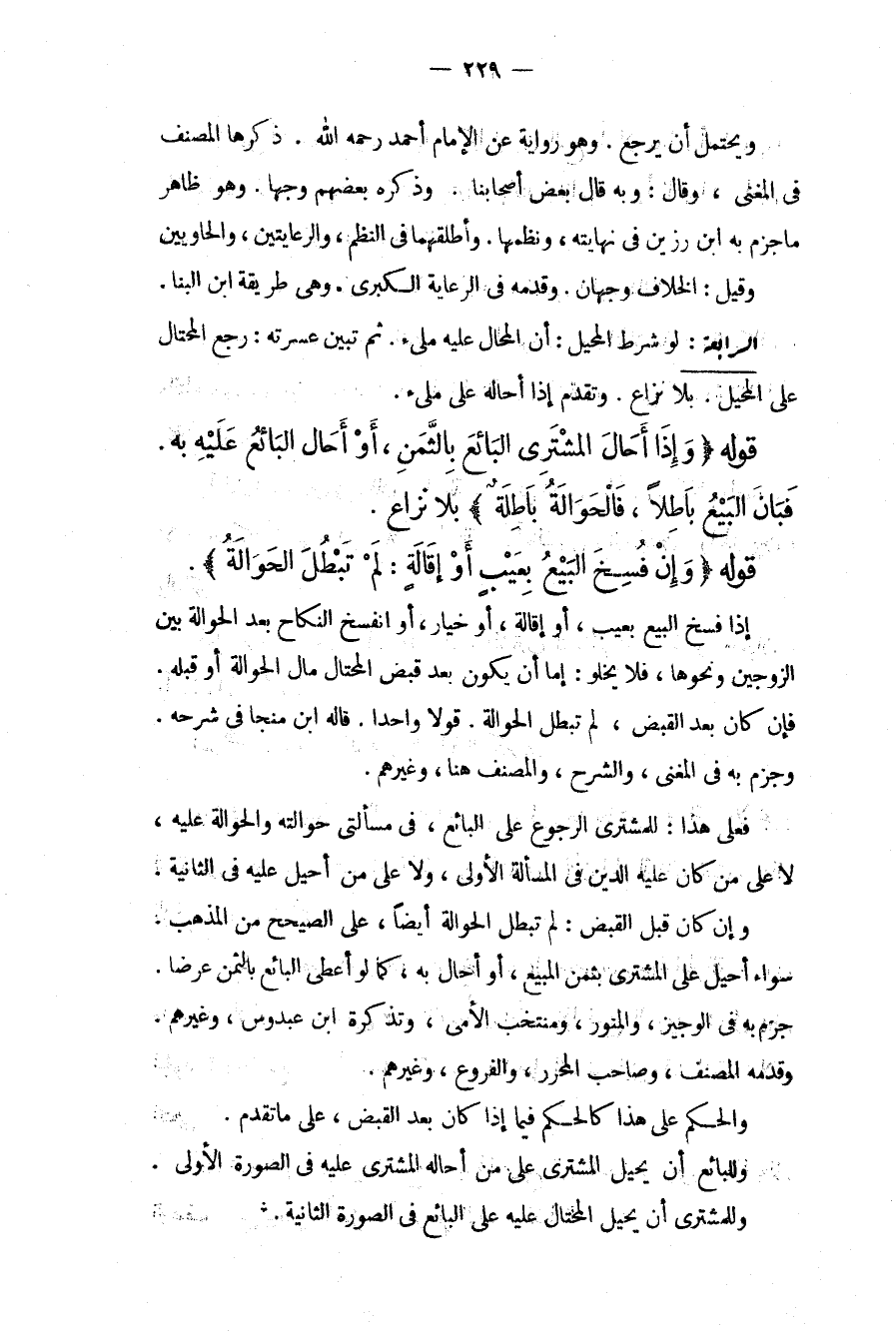 قَوْلُهُ (وَإِذَا أَحَالَ الْمُشْتَرِي الْبَائِعَ بِالثَّمَنِ، أَوْ أَحَالَ الْبَائِعُ عَلَيْهِ بِهِ. فَبَانَ الْبَيْعُ بَاطِلًا، فَالْحَوَالَةُ بَاطِلَةٌ) بِلَا نِزَاعٍ. قَوْلُهُ (وَإِنْ فُسِخَ الْبَيْعُ بِعَيْبٍ أَوْ إقَالَةٍ: لَمْ تَبْطُلْ الْحَوَالَةُ) . إذَا فُسِخَ الْبَيْعُ بِعَيْبٍ، أَوْ إقَالَةٍ، أَوْ خِيَارٍ، أَوْ انْفَسَخَ النِّكَاحُ بَعْدَ الْحَوَالَةِ بَيْنَ الزَّوْجَيْنِ وَنَحْوِهَا، فَلَا يَخْلُو: إمَّا أَنْ يَكُونَ بَعْدَ قَبْضِ الْمُحْتَالِ مَالَ الْحَوَالَةِ أَوْ قَبْلَهُ. فَإِنْ كَانَ بَعْدَ الْقَبْضِ، لَمْ تَبْطُلْ الْحَوَالَةُ. قَوْلًا وَاحِدًا. قَالَهُ ابْنُ مُنَجَّى فِي شَرْحِهِ. وَجَزَمَ بِهِ فِي الْمُغْنِي، وَالشَّرْحِ، وَالْمُصَنِّفُ هُنَا، وَغَيْرُهُمْ. فَعَلَى هَذَا: لِلْمُشْتَرِي الرُّجُوعُ عَلَى الْبَائِعِ، فِي مَسْأَلَتَيْ حَوَالَتِهِ وَالْحَوَالَةِ عَلَيْهِ، لَا عَلَى مَنْ كَانَ عَلَيْهِ الدَّيْنُ فِي الْمَسْأَلَةِ الْأُولَى، وَلَا عَلَى مَنْ أُحِيلَ عَلَيْهِ فِي الثَّانِيَةِ. وَإِنْ كَانَ قَبْلَ الْقَبْضِ: لَمْ تَبْطُلْ الْحَوَالَةُ أَيْضًا، عَلَى الصَّحِيحِ مِنْ الْمَذْهَبِ. سَوَاءٌ أُحِيلَ عَلَى الْمُشْتَرِي بِثَمَنِ الْمَبِيعِ، أَوْ أَحَالَ بِهِ كَمَا لَوْ أَعْطَى الْبَائِعُ بِالثَّمَنِ عَرْضًا. جَزَمَ بِهِ فِي الْوَجِيزِ، وَالْمُنَوِّرِ، وَمُنْتَخَبِ الْأَدَمِيِّ، وَتَذْكِرَةِ ابْنِ عَبْدُوسٍ، وَغَيْرِهِمْ. وَقَدَّمَهُ الْمُصَنِّفُ، وَصَاحِبُ الْمُحَرَّرِ، وَالْفُرُوعِ، وَغَيْرِهِمْ. وَالْحُكْمُ عَلَى هَذَا كَالْحُكْمِ فِيمَا إذَا كَانَ بَعْدَ الْقَبْضِ، عَلَى مَا تَقَدَّمَ. وَلِلْبَائِعِ أَنْ يُحِيلَ الْمُشْتَرِيَ عَلَى مَنْ أَحَالَهُ الْمُشْتَرِي عَلَيْهِ فِي الصُّورَةِ الْأُولَى. وَلِلْمُشْتَرِي أَنْ يُحِيلَ الْمُحْتَالَ عَلَيْهِ عَلَى الْبَائِعِ فِي الصُّورَةِ الثَّانِيَةِ.