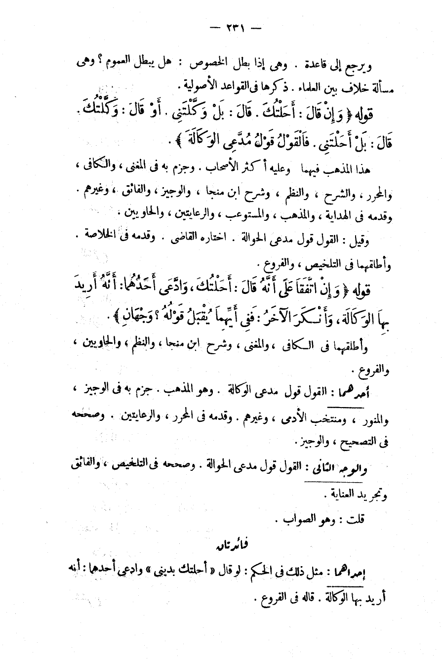 إحْدَاهُمَا: مِثْلُ ذَلِكَ فِي الْحُكْمِ: لَوْ قَالَ " أَحَلْتُك بِدَيْنِي " وَادَّعَى أَحَدُهُمَا: أَنَّهُ أُرِيدَ بِهَا الْوَكَالَةُ. قَالَهُ فِي الْفُرُوعِ.