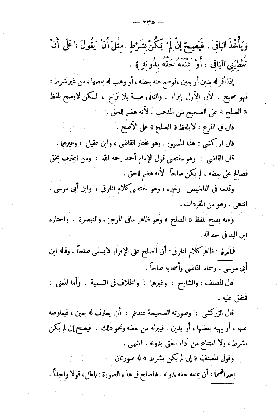 فَائِدَةٌ: ظَاهِرُ كَلَامِ الْخِرَقِيِّ: أَنَّ الصُّلْحَ عَلَى الْإِقْرَارِ لَا يُسَمَّى صُلْحًا. وَقَالَهُ ابْنُ أَبِي مُوسَى. وَسَمَّاهُ الْقَاضِي وَأَصْحَابُهُ صُلْحًا. قَالَ الْمُصَنِّفُ، وَالشَّارِحُ، وَغَيْرُهُمَا: وَالْخِلَافُ فِي التَّسْمِيَةِ. وَأَمَّا الْمَعْنَى: فَمُتَّفَقٌ عَلَيْهِ. قَالَ الزَّرْكَشِيُّ: وَصُورَتُهُ الصَّحِيحَةُ عِنْدَهُمْ: أَنْ يَعْتَرِفَ لَهُ بِعَيْنٍ، فَيُعَاوِضُهُ عَنْهَا، أَوْ يَهَبَهُ بَعْضَهَا، أَوْ بِدَيْنٍ. فَيُبْرِئَهُ مِنْ بَعْضِهِ وَنَحْوِ ذَلِكَ. فَيَصِحُّ إنْ لَمْ يَكُنْ بِشَرْطٍ، وَلَا امْتِنَاعَ مِنْ أَدَاءِ الْحَقِّ بِدُونِهِ. انْتَهَى. وَقَوْلُ الْمُصَنِّفِ " إنْ لَمْ يَكُنْ بِشَرْطٍ " لَهُ صُورَتَانِ. إحْدَاهُمَا: أَنْ يَمْنَعَهُ حَقَّهُ بِدُونِهِ. فَالصُّلْحُ فِي هَذِهِ الصُّورَةِ: بَاطِلٌ، قَوْلًا وَاحِدًا.