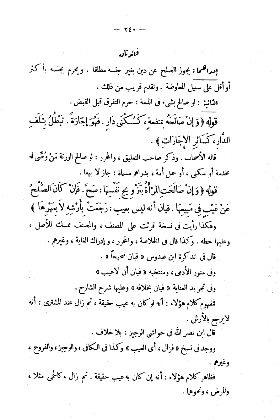 فَائِدَتَانِ إحْدَاهُمَا: يَجُوزُ الصُّلْحُ عَنْ دَيْنٍ بِغَيْرِ جِنْسِهِ مُطْلَقًا. وَيَحْرُمُ بِجِنْسِهِ بِأَكْثَرَ أَوْ أَقَلَّ عَلَى سَبِيلِ الْمُعَاوَضَةِ. وَتَقَدَّمَ قَرِيبٌ مِنْ ذَلِكَ. الثَّانِيَةُ: لَوْ صَالَحَ بِشَيْءٍ فِي الذِّمَّةِ: حَرُمَ التَّفَرُّقُ قَبْلَ الْقَبْضِ.