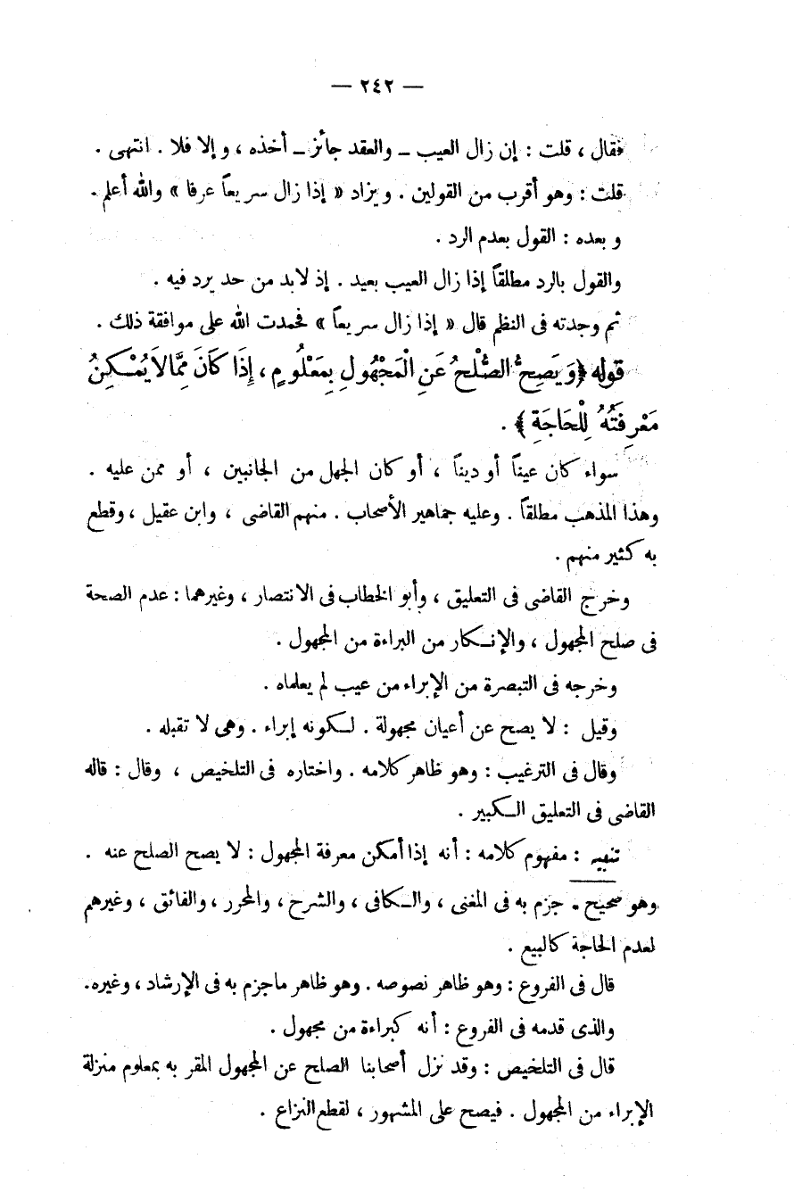 تَنْبِيهٌ: مَفْهُومُ كَلَامِهِ: أَنَّهُ إذَا أَمْكَنَ مَعْرِفَةُ الْمَجْهُولِ: لَا يَصِحُّ الصُّلْحُ عَنْهُ. وَهُوَ صَحِيحٌ. جَزَمَ بِهِ فِي الْمُغْنِي، وَالْكَافِي، وَالشَّرْحِ، وَالْمُحَرَّرِ، وَالْفَائِقِ، وَغَيْرِهِمْ لِعَدَمِ الْحَاجَةِ كَالْبَيْعِ. قَالَ فِي الْفُرُوعِ: وَهُوَ ظَاهِرُ نُصُوصِهِ. وَهُوَ ظَاهِرُ مَا جَزَمَ بِهِ فِي الْإِرْشَادِ، وَغَيْرِهِ. وَاَلَّذِي قَدَّمَهُ فِي الْفُرُوعِ: أَنَّهُ كَبَرَاءَةٍ مِنْ مَجْهُولٍ. قَالَ فِي التَّلْخِيصِ: وَقَدْ نَزَّلَ أَصْحَابُنَا الصُّلْحَ عَنْ الْمَجْهُولِ الْمُقَرِّ بِهِ بِمَعْلُومٍ مَنْزِلَةَ الْإِبْرَاءِ مِنْ الْمَجْهُولِ. فَيَصِحُّ عَلَى الْمَشْهُورِ، لِقَطْعِ النِّزَاعِ.