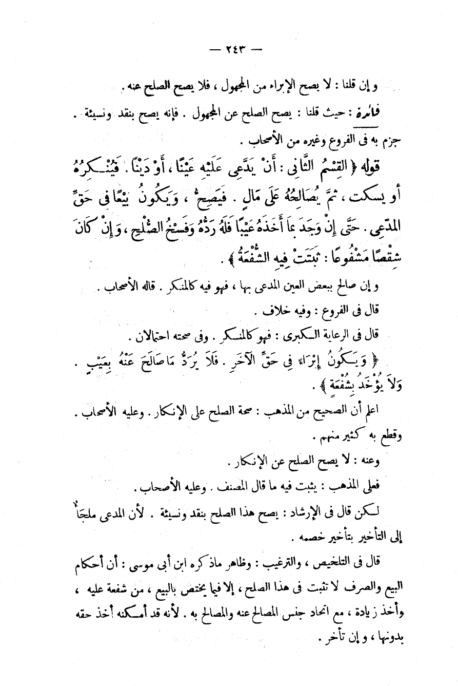قَوْلُهُ (الْقِسْمُ الثَّانِي: أَنْ يَدَّعِيَ عَلَيْهِ عَيْنًا، أَوْ دَيْنًا. فَيُنْكِرَهُ أَوْ يَسْكُتَ، ثُمَّ يُصَالِحَهُ عَلَى مَالٍ. فَيَصِحُّ، وَيَكُونُ بَيْعًا فِي حَقِّ الْمُدَّعِي. حَتَّى إنْ وَجَدَ بِمَا أَخَذَهُ عَيْبًا فَلَهُ رَدُّهُ وَفَسْخُ الصُّلْحِ، وَإِنْ كَانَ شِقْصًا مَشْفُوعًا: ثَبَتَتْ فِيهِ الشُّفْعَةُ) . وَإِنْ صَالَحَ بِبَعْضِ الْعَيْنِ الْمُدَّعَى بِهَا، فَهُوَ فِيهِ كَالْمُنْكِرِ. قَالَهُ الْأَصْحَابُ. قَالَ فِي الْفُرُوعِ: وَفِيهِ خِلَافٌ. قَالَ فِي الرِّعَايَةِ الْكُبْرَى: فَهُوَ كَالْمُنْكِرِ. وَفِي صِحَّتِهِ احْتِمَالَانِ. (وَيَكُونُ إبْرَاءً فِي حَقِّ الْآخَرِ. فَلَا يُرَدُّ مَا صَالَحَ عَنْهُ بِعَيْبٍ وَلَا يُؤْخَذُ بِشُفْعَةٍ) . اعْلَمْ أَنَّ الصَّحِيحَ مِنْ الْمَذْهَبِ: صِحَّةُ الصُّلْحِ عَلَى الْإِنْكَارِ. وَعَلَيْهِ الْأَصْحَابُ. وَقَطَعَ بِهِ كَثِيرٌ مِنْهُمْ. وَعَنْهُ: لَا يَصِحُّ الصُّلْحُ عَنْ الْإِنْكَارِ. فَعَلَى الْمَذْهَبِ: يَثْبُتُ فِيهِ مَا قَالَ الْمُصَنِّفُ. وَعَلَيْهِ الْأَصْحَابُ. لَكِنْ قَالَ فِي الْإِرْشَادِ: يَصِحُّ هَذَا الصُّلْحُ بِنَقْدٍ وَنَسِيئَةٍ؛ لِأَنَّ الْمُدَّعِيَ مُلْجَأٌ إلَى التَّأْخِيرِ بِتَأْخِيرِ خَصْمِهِ. قَالَ فِي التَّلْخِيصِ، وَالتَّرْغِيبِ: وَظَاهِرُ مَا ذَكَرَهُ ابْنُ أَبِي مُوسَى: أَنَّ أَحْكَامَ الْبَيْعِ وَالصَّرْفِ لَا تَثْبُتُ فِي هَذَا الصُّلْحِ، إلَّا فِيمَا يَخْتَصُّ بِالْبَيْعِ، مِنْ شُفْعَةٍ عَلَيْهِ، وَأَخْذِ زِيَادَةٍ، مَعَ اتِّحَادِ جِنْسِ الْمُصَالَحِ عَنْهُ وَالْمُصَالَحِ بِهِ؛ لِأَنَّهُ قَدْ أَمْكَنَهُ أَخْذُ حَقِّهِ بِدُونِهَا، وَإِنْ تَأَخَّرَ.