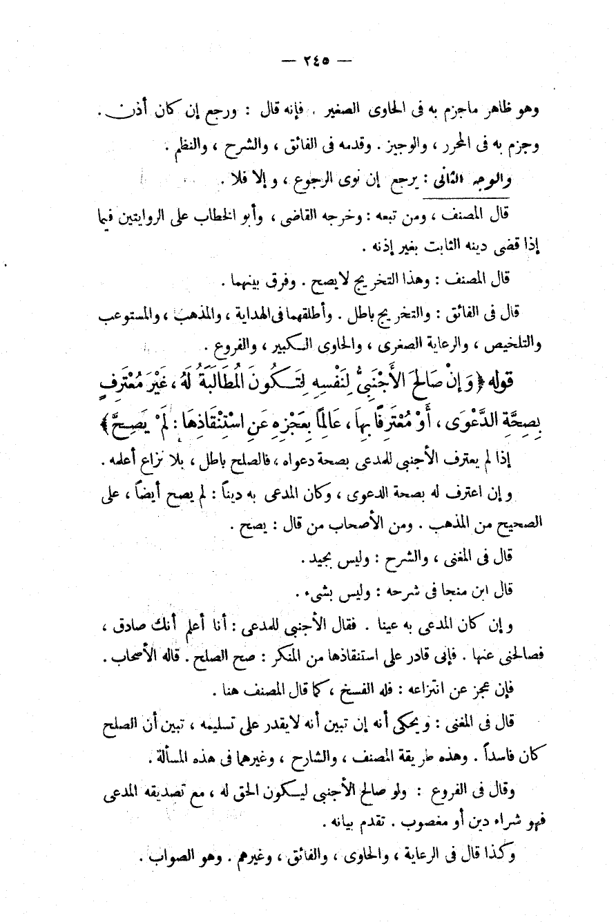 قَوْلُهُ (وَإِنْ صَالَحَ الْأَجْنَبِيُّ لِنَفْسِهِ لِتَكُونَ الْمُطَالَبَةُ لَهُ، غَيْرَ مُعْتَرِفٍ بِصِحَّةِ الدَّعْوَى، أَوْ مُعْتَرِفًا بِهَا، عَالِمًا بِعَجْزِهِ عَنْ اسْتِنْقَاذِهَا: لَمْ يَصِحَّ) إذَا لَمْ يَعْتَرِفْ الْأَجْنَبِيُّ لِلْمُدَّعِي بِصِحَّةِ دَعْوَاهُ، فَالصُّلْحُ بَاطِلٌ، بِلَا نِزَاعٍ أَعْلَمُهُ. وَإِنْ اعْتَرَفَ لَهُ بِصِحَّةِ الدَّعْوَى، وَكَانَ الْمُدَّعَى بِهِ دَيْنًا: لَمْ يَصِحَّ أَيْضًا، عَلَى الصَّحِيحِ مِنْ الْمَذْهَبِ. وَمِنْ الْأَصْحَابِ مَنْ قَالَ: يَصِحُّ. قَالَ فِي الْمُغْنِي، وَالشَّرْحِ: وَلَيْسَ بِجَيِّدٍ. قَالَ ابْنُ مُنَجَّى فِي شَرْحِهِ: وَلَيْسَ بِشَيْءٍ. وَإِنْ كَانَ الْمُدَّعَى بِهِ عَيْنًا. فَقَالَ الْأَجْنَبِيُّ لِلْمُدَّعِي: أَنَا أَعْلَمُ أَنَّك صَادِقٌ، فَصَالِحْنِي عَنْهَا. فَإِنِّي قَادِرٌ عَلَى اسْتِنْقَاذِهَا مِنْ الْمُنْكِرِ: صَحَّ الصُّلْحُ. قَالَهُ الْأَصْحَابُ. فَإِنْ عَجَزَ عَنْ انْتِزَاعِهِ: فَلَهُ الْفَسْخُ، كَمَا قَالَ الْمُصَنِّفُ هُنَا. قَالَ فِي الْمُغْنِي: وَيُحْكَى أَنَّهُ إنْ تَبَيَّنَ أَنَّهُ لَا يَقْدِرُ عَلَى تَسْلِيمِهِ. تَبَيَّنَ أَنَّ الصُّلْحَ كَانَ فَاسِدًا. وَهَذِهِ طَرِيقَةُ الْمُصَنِّفِ، وَالشَّارِحِ، وَغَيْرِهِمَا فِي هَذِهِ الْمَسْأَلَةِ. وَقَالَ فِي الْفُرُوعِ. وَلَوْ صَالَحَ الْأَجْنَبِيُّ لِيَكُونَ الْحَقُّ لَهُ، مَعَ تَصْدِيقِهِ الْمُدَّعِي فَهُوَ شِرَاءُ دَيْنٍ أَوْ مَغْصُوبٍ. تَقَدَّمَ بَيَانُهُ. وَكَذَا قَالَ فِي الرِّعَايَةِ، وَالْحَاوِي، وَالْفَائِقِ، وَغَيْرِهِمْ وَهُوَ الصَّوَابُ.