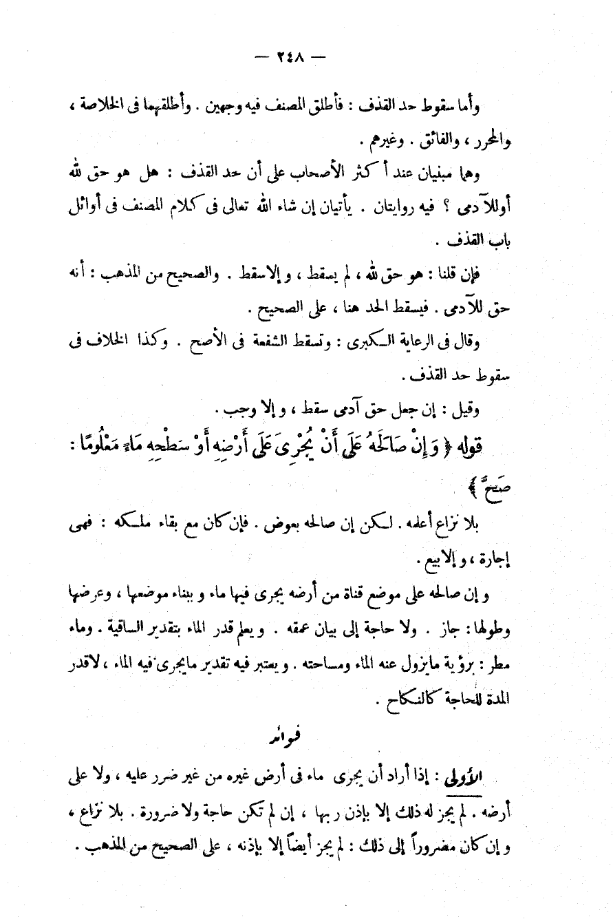 ُ الْأُولَى: إذَا أَرَادَ أَنْ يُجْرِيَ مَاءً فِي أَرْضِ غَيْرِهِ مِنْ غَيْرِ ضَرَرٍ عَلَيْهِ، وَلَا عَلَى أَرْضِهِ. لَمْ يَجُزْ لَهُ ذَلِكَ إلَّا بِإِذْنِ رَبِّهَا، إنْ لَمْ تَكُنْ حَاجَةٌ وَلَا ضَرُورَةٌ. بِلَا نِزَاعٍ، وَإِنْ كَانَ مَضْرُورًا إلَى ذَلِكَ: لَمْ يَجُزْ أَيْضًا إلَّا بِإِذْنِهِ، عَلَى الصَّحِيحِ مِنْ الْمَذْهَبِ.