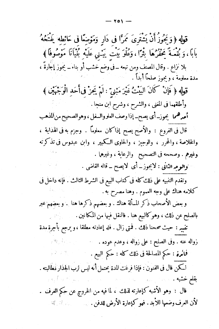 قَوْلُهُ (وَيَجُوزُ أَنْ يَشْتَرِيَ مَمَرًّا فِي دَارٍ وَمَوْضِعًا فِي حَائِطِهِ يَفْتَحُهُ بَابًا، وَبُقْعَةً يَحْفِرُهَا بِئْرًا، وَعُلُوَّ بَيْتٍ يَبْنِي عَلَيْهِ بُنْيَانًا مَوْصُوفًا) بِلَا نِزَاعٍ. وَقَالَ الْمُصَنِّفُ وَمَنْ تَبِعَهُ فِي وَضْعِ خَشَبٍ أَوْ بِنَاءٍ يَجُوزُ إجَارَةً، مُدَّةً مَعْلُومَةً، وَيَجُوزُ صُلْحًا أَبَدًا. قَوْلُهُ (فَإِنْ كَانَ الْبَيْتُ غَيْرَ مَبْنِيٍّ: لَمْ يَجُزْ فِي أَحَدِ الْوَجْهَيْنِ) وَأَطْلَقَهُمَا فِي الْمُغْنِي، وَالشَّرْحِ، وَشَرْحِ ابْنِ مُنَجَّى. أَحَدُهُمَا يَجُوزُ أَيْ يَصِحُّ إذَا وَصَفَ الْعُلْوَ وَالسُّفْلَ، وَهُوَ الصَّحِيحُ مِنْ الْمَذْهَبِ. قَالَ فِي الْفُرُوعِ: وَالْأَصَحُّ يَصِحُّ إذَا كَانَ مَعْلُومًا. وَجَزَمَ بِهِ فِي الْهِدَايَةِ، وَالْخُلَاصَةِ، وَالْمُحَرَّرِ، وَالْوَجِيزِ، وَالْحَاوِي الْكَبِيرِ، وَابْنِ عَبْدُوسٍ فِي تَذْكِرَتِهِ وَغَيْرِهِمْ. وَصَحَّحَهُ فِي التَّصْحِيحِ وَالرِّعَايَةِ، وَغَيْرِهِمَا. وَالْوَجْهُ الثَّانِي: لَا يَجُوزُ أَيْ لَا يَصِحُّ قَالَهُ الْقَاضِي. وَتَقَدَّمَ التَّنْبِيهُ عَلَى ذَلِكَ كُلِّهِ فِي كِتَابِ الْبَيْعِ فِي الشَّرْطِ الثَّالِثِ. فَإِنَّهُ دَاخِلٌ فِي كَلَامِهِ هُنَاكَ عَلَى وَجْهِ الْعُمُومِ. وَهُنَا مُصَرَّحٌ بِهِ. وَبَعْضُ الْأَصْحَابِ ذَكَرَ الْمَسْأَلَةَ هُنَاكَ. وَبَعْضُهُمْ ذَكَرَهَا هُنَا. وَبَعْضُهُمْ عَبَّرَ بِالصُّلْحِ عَنْ ذَلِكَ، وَهُوَ كَالْبَيْعِ هُنَا. فَالنَّقْلُ فِيهَا مِنْ الْمَكَانَيْنِ.