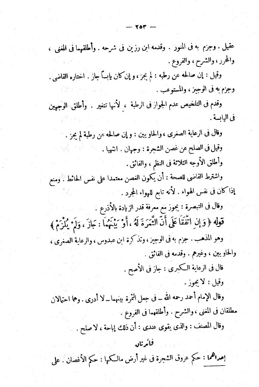 وَجَزَمَ بِهِ فِي الْمُنَوِّرِ. وَقَدَّمَهُ ابْنُ رَزِينٍ فِي شَرْحِهِ. وَأَطْلَقَهُمَا فِي الْمُغْنِي، وَالْمُحَرَّرِ، وَالشَّرْحِ، وَالْفُرُوعِ. وَقِيلَ: إنْ صَالَحَهُ عَنْ رَطْبَةٍ: لَمْ يَجُزْ، وَإِنْ كَانَ يَابِسًا جَازَ. اخْتَارَهُ الْقَاضِي. وَجَزَمَ بِهِ فِي الْوَجِيزِ، وَالْمُسْتَوْعِبِ. وَقَدَّمَ فِي التَّلْخِيصِ عَدَمَ الْجَوَازِ فِي الرَّطْبَةِ، لِأَنَّهَا تَتَغَيَّرُ. وَأَطْلَقَ الْوَجْهَيْنِ فِي الْيَابِسَةِ. وَقَالَ فِي الرِّعَايَةِ الصُّغْرَى، وَالْحَاوِيَيْنِ: وَإِنْ صَالَحَهُ عَنْ رَطْبَةٍ لَمْ يَجُزْ. وَقِيلَ فِي الصُّلْحِ عَنْ غُصْنِ الشَّجَرَةِ: وَجْهَانِ. انْتَهَيَا. وَأَطْلَقَ الْأَوْجُهَ الثَّلَاثَةَ فِي النَّظْمِ، وَالْفَائِقِ. وَاشْتَرَطَ الْقَاضِي لِلصِّحَّةِ: أَنْ يَكُونَ الْغُصْنُ مُعْتَمِدًا عَلَى نَفْسِ الْحَائِطِ. وَمُنِعَ إذَا كَانَ فِي نَفْسِ الْهَوَاءِ؛ لِأَنَّهُ تَابِعٌ لِلْهَوَاءِ الْمُجَرَّدِ. وَقَالَ فِي التَّبْصِرَةِ: يَجُوزُ مَعَ مَعْرِفَةِ قَدْرِ الزِّيَادَةِ بِالْأَذْرُعِ. قَوْلُهُ (وَإِنْ اتَّفَقَا عَلَى أَنَّ الثَّمَرَةَ لَهُ، أَوْ بَيْنَهُمَا: جَازَ، وَلَمْ يَلْزَمْ) وَهُوَ الْمَذْهَبُ. جَزَمَ بِهِ فِي الْوَجِيزِ، وَتَذْكِرَةِ ابْنِ عَبْدُوسٍ، وَالرِّعَايَةِ الصُّغْرَى، وَالْحَاوِيَيْنِ، وَغَيْرِهِمْ. وَقَدَّمَهُ فِي الْفَائِقِ. قَالَ فِي الرِّعَايَةِ الْكُبْرَى: جَازَ فِي الْأَصَحِّ. وَقِيلَ: لَا يَجُوزُ. وَقَالَ الْإِمَامُ أَحْمَدُ - رَحِمَهُ اللَّهُ - فِي جَعْلِ الثَّمَرَةِ بَيْنَهُمَا لَا أَدْرِي. وَهُمَا احْتِمَالَانِ مُطْلَقَانِ فِي الْمُغْنِي، وَالشَّرْحِ. وَأَطْلَقَهُمَا فِي الْفُرُوعِ. وَقَالَ الْمُصَنِّفُ: وَاَلَّذِي يَقْوَى عِنْدِي: أَنَّ ذَلِكَ إبَاحَةً، لَا صُلْحَ.