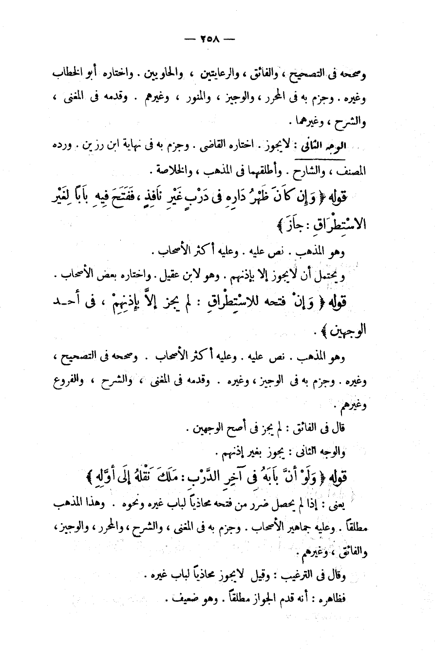 قَوْلُهُ (وَإِنْ كَانَ ظَهْرُ دَارِهِ فِي دَرْبٍ غَيْرِ نَافِذٍ، فَفَتَحَ فِيهِ بَابًا لِغَيْرِ الِاسْتِطْرَاقِ: جَازَ) . وَهُوَ الْمَذْهَبُ. نَصَّ عَلَيْهِ. وَعَلَيْهِ أَكْثَرُ الْأَصْحَابِ. وَيُحْتَمَلُ أَنْ لَا يَجُوزَ إلَّا بِإِذْنِهِمْ. وَهُوَ لِابْنِ عَقِيلٍ. وَاخْتَارَهُ بَعْضُ الْأَصْحَابِ. قَوْلُهُ (وَإِنْ فَتَحَهُ لِلِاسْتِطْرَاقِ: لَمْ يَجُزْ إلَّا بِإِذْنِهِمْ، فِي أَحَدِ الْوَجْهَيْنِ) . وَهُوَ الْمَذْهَبُ. نَصَّ عَلَيْهِ. وَعَلَيْهِ أَكْثَرُ الْأَصْحَابِ. وَصَحَّحَهُ فِي التَّصْحِيحِ، وَغَيْرِهِ. وَجَزَمَ بِهِ فِي الْوَجِيزِ، وَغَيْرِهِ. وَقَدَّمَهُ فِي الْمُغْنِي، وَالشَّرْحِ، وَالْفُرُوعِ وَغَيْرِهِمْ. قَالَ فِي الْفَائِقِ: لَمْ يَجُزْ فِي أَصَحِّ الْوَجْهَيْنِ. وَالْوَجْهُ الثَّانِي: يَجُوزُ بِغَيْرِ إذْنِهِمْ. قَوْلُهُ (وَلَوْ أَنَّ بَابَهُ فِي آخِرِ الدَّرْبِ: مَلَكَ نَقْلَهُ إلَى أَوَّلِهِ) . يَعْنِي: إذَا لَمْ يَحْصُلْ ضَرَرٌ مِنْ فَتْحِهِ مُحَاذِيًا لِبَابِ غَيْرِهِ وَنَحْوِهِ. وَهَذَا الْمَذْهَبُ مُطْلَقًا. وَعَلَيْهِ جَمَاهِيرُ الْأَصْحَابِ. وَجَزَمَ بِهِ فِي الْمُغْنِي، وَالشَّرْحِ، وَالْمُحَرَّرِ، وَالْوَجِيزِ، وَالْفَائِقِ، وَغَيْرِهِمْ. وَقَالَ فِي التَّرْغِيبِ: وَقِيلَ لَا يَجُوزُ مُحَاذِيًا لِبَابِ غَيْرِهِ. فَظَاهِرُهُ: أَنَّهُ قَدَّمَ الْجَوَازَ مُطْلَقًا. وَهُوَ ضَعِيفٌ.
