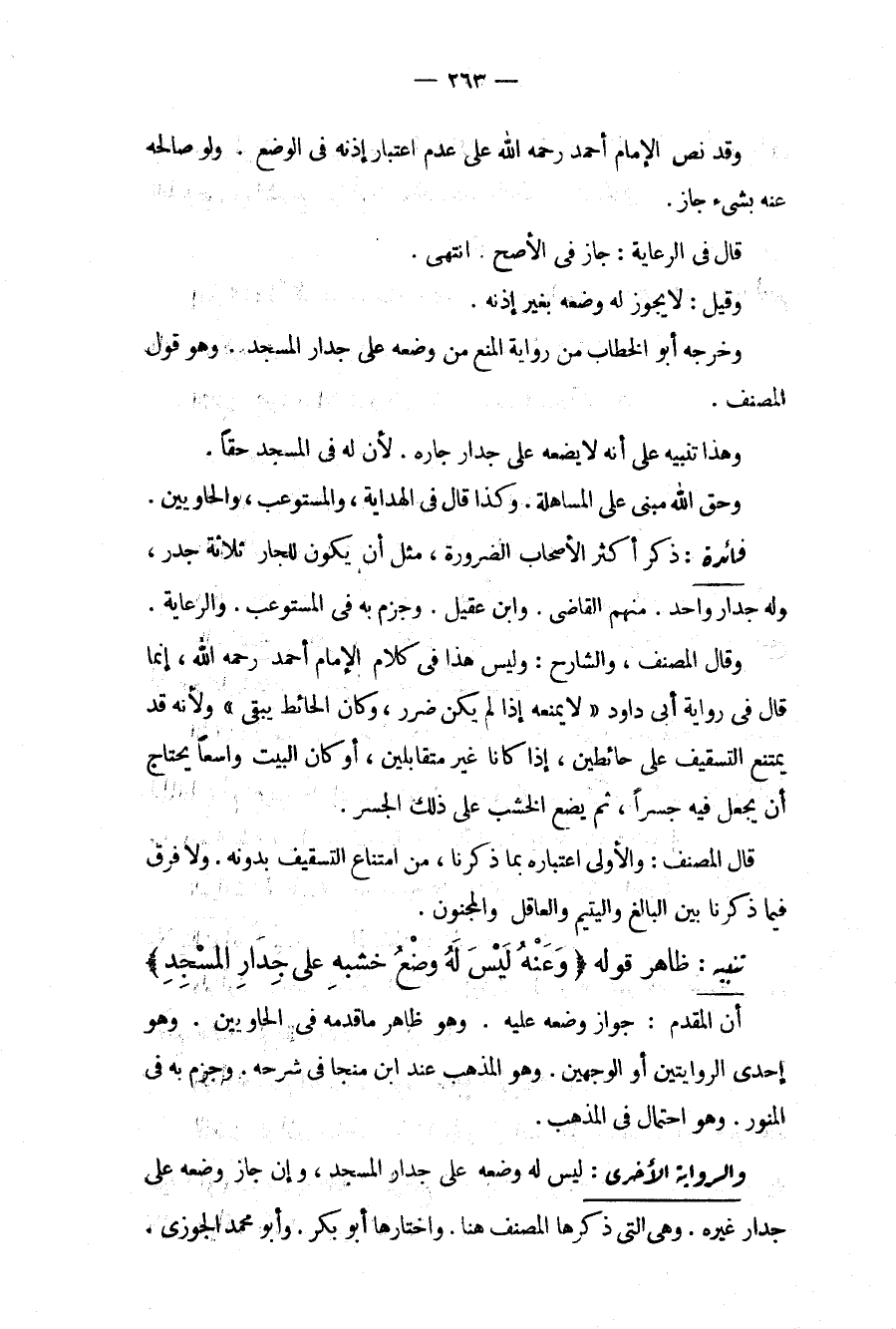 تَنْبِيهٌ: ظَاهِرُ قَوْلِهِ (وَعَنْهُ لَيْسَ لَهُ وَضْعُ خَشَبِهِ عَلَى جِدَارِ الْمَسْجِدِ) . أَنَّ الْمُقَدَّمَ: جَوَازُ وَضْعِهِ عَلَيْهِ. وَهُوَ ظَاهِرُ مَا قَدَّمَهُ فِي الْحَاوِيَيْنِ. وَهُوَ إحْدَى الرِّوَايَتَيْنِ أَوْ الْوَجْهَيْنِ. وَهُوَ الْمَذْهَبُ عِنْدَ ابْنِ مُنَجَّى فِي شَرْحِهِ. وَجَزَمَ بِهِ فِي الْمُنَوِّرِ. وَهُوَ احْتِمَالٌ فِي الْمَذْهَبِ. وَالرِّوَايَةُ الْأُخْرَى: لَيْسَ لَهُ وَضْعُهُ عَلَى جِدَارِ الْمَسْجِدِ، وَإِنْ جَازَ وَضْعُهُ عَلَى جِدَارِ غَيْرِهِ. وَهِيَ الَّتِي ذَكَرَهَا الْمُصَنِّفُ هُنَا. وَاخْتَارَهَا أَبُو بَكْرٍ. وَأَبُو مُحَمَّدٍ الْجَوْزِيُّ.
