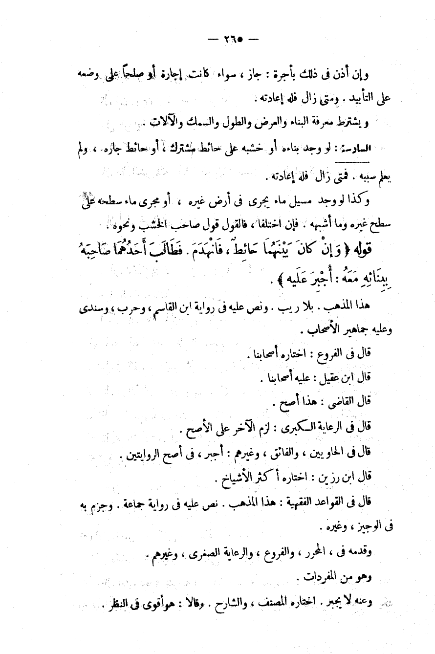 قَوْلُهُ (وَإِنْ كَانَ بَيْنَهُمَا حَائِطٌ، فَانْهَدَمَ. فَطَالَبَ أَحَدُهُمَا صَاحِبَهُ بِبِنَائِهِ مَعَهُ: أُجْبِرَ عَلَيْهِ) . هَذَا الْمَذْهَبُ. بِلَا رَيْبٍ. وَنَصَّ عَلَيْهِ فِي رِوَايَةِ ابْنِ الْقَاسِمِ، وَحَرْبٍ، وَسِنْدِيٍّ وَعَلَيْهِ جَمَاهِيرُ الْأَصْحَابِ. قَالَ فِي الْفُرُوعِ: اخْتَارَهُ أَصْحَابُنَا. قَالَ ابْنُ عَقِيلٍ: عَلَيْهِ أَصْحَابُنَا. قَالَ الْقَاضِي: هَذَا أَصَحُّ. قَالَ فِي الرِّعَايَةِ الْكُبْرَى: لَزِمَ الْآخَرَ عَلَى الْأَصَحِّ. قَالَ فِي الْحَاوِيَيْنِ، وَالْفَائِقِ، وَغَيْرِهِمْ: أُجْبِرَ، فِي أَصَحِّ الرِّوَايَتَيْنِ. قَالَ ابْنُ رَزِينٍ: اخْتَارَهُ أَكْثَرُ الْأَشْيَاخِ. قَالَ فِي الْقَوَاعِدِ الْفِقْهِيَّةِ: هَذَا الْمَذْهَبُ. نَصَّ عَلَيْهِ فِي رِوَايَةِ جَمَاعَةٌ. وَجَزَمَ بِهِ فِي الْوَجِيزِ، وَغَيْرِهِ. وَقَدَّمَهُ فِي الْمُحَرَّرِ، وَالْفُرُوعِ، وَالرِّعَايَةِ الصُّغْرَى، وَغَيْرِهِمْ. وَهُوَ مِنْ الْمُفْرَدَاتِ. وَعَنْهُ لَا يُجْبَرُ. اخْتَارَهُ الْمُصَنِّفُ، وَالشَّارِحُ. وَقَالَا: هُوَ أَقْوَى فِي النَّظَرِ.
