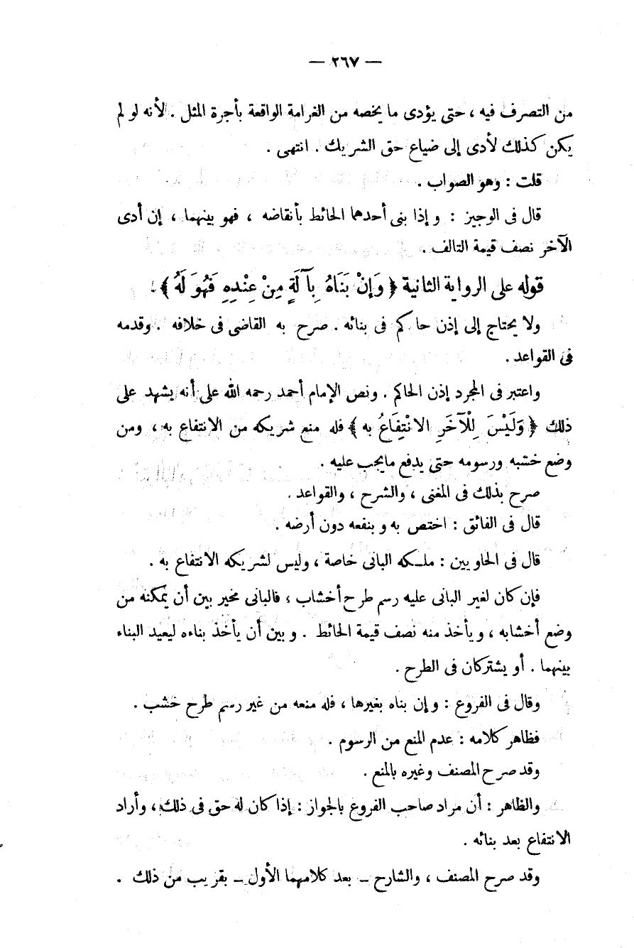 قُلْت: وَهُوَ الصَّوَابُ. قَالَ فِي الْوَجِيزِ: وَإِذَا بَنَى أَحَدُهُمَا الْحَائِطَ بِأَنْقَاضِهِ. فَهُوَ بَيْنَهُمَا، إنْ أَدَّى الْآخَرُ نِصْفَ قِيمَةِ التَّالِفِ. قَوْلُهُ عَلَى الرِّوَايَةِ الثَّانِيَةِ (وَإِنْ بَنَاهُ بِآلَةٍ مِنْ عِنْدِهِ فَهُوَ لَهُ) . وَلَا يَحْتَاجُ إلَى إذْنِ حَاكِمٍ فِي بِنَائِهِ. صَرَّحَ بِهِ الْقَاضِي فِي خِلَافِهِ. وَقَدَّمَهُ فِي الْقَوَاعِدِ. وَاعْتَبَرَ فِي الْمُجَرَّدِ إذْنَ الْحَاكِمِ. وَنَصَّ الْإِمَامُ أَحْمَدُ - رَحِمَهُ اللَّهُ - عَلَى أَنَّهُ يُشْهِدُ عَلَى ذَلِكَ (وَلَيْسَ لِلْآخَرِ الِانْتِفَاعُ بِهِ) فَلَهُ مَنْعُ شَرِيكِهِ مِنْ الِانْتِفَاعِ بِهِ، وَمِنْ وَضْعِ خَشَبِهِ وَرُسُومِهِ حَتَّى يَدْفَعَ مَا يَجِبُ عَلَيْهِ. صَرَّحَ بِذَلِكَ فِي الْمُغْنِي، وَالشَّرْحِ، وَالْقَوَاعِدِ. قَالَ فِي الْفَائِقِ: اخْتَصَّ بِهِ وَبِنَفْعِهِ دُونَ أَرْضِهِ. قَالَ فِي الْحَاوِيَيْنِ: مَلَكَهُ الْبَانِي خَاصَّةً، وَلَيْسَ لِشَرِيكِهِ الِانْتِفَاعُ بِهِ. فَإِنْ كَانَ لِغَيْرِ الْبَانِي عَلَيْهِ رَسْمُ طَرْحِ أَخْشَابٍ، فَالْبَانِي مُخَيَّرٌ بَيْنَ أَنْ يُمَكِّنَهُ مِنْ وَضْعِ أَخْشَابِهِ، وَيَأْخُذَ مِنْهُ نِصْفَ قِيمَةِ الْحَائِطِ. وَبَيْنَ أَنْ يَأْخُذَ بِنَاءَهُ لِيُعِيدَ الْبِنَاءَ بَيْنَهُمَا. أَوْ يَشْتَرِكَانِ فِي الطَّرْحِ. وَقَالَ فِي الْفُرُوعِ: وَإِنْ بَنَاهُ بِغَيْرِهَا، فَلَهُ مَنْعُهُ مِنْ غَيْرِ رَسْمِ طَرْحِ خَشَبٍ. فَظَاهِرُ كَلَامِهِ: عَدَمُ الْمَنْعِ مِنْ الرُّسُومِ. وَقَدْ صَرَّحَ الْمُصَنِّفُ وَغَيْرُهُ بِالْمَنْعِ. وَالظَّاهِرُ: أَنَّ مُرَادَ صَاحِبِ الْفُرُوعِ بِالْجَوَازِ: إذَا كَانَ لَهُ حَقٌّ فِي ذَلِكَ، وَأَرَادَ الِانْتِفَاعَ بَعْدَ بِنَائِهِ. وَقَدْ صَرَّحَ الْمُصَنِّفُ، وَالشَّارِحُ بَعْدَ كَلَامِهِمَا الْأَوَّلِ بِقَرِيبٍ مِنْ ذَلِكَ.