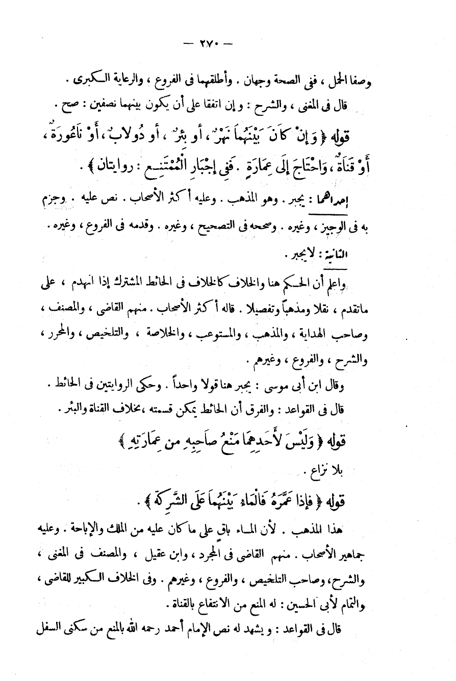 قَوْلُهُ (وَإِنْ كَانَ بَيْنَهُمَا نَهْرٌ، أَوْ بِئْرٌ، أَوْ دُولَابٌ، أَوْ نَاعُورَةٌ، أَوْ قَنَاةٌ، وَاحْتَاجَ إلَى عِمَارَةٍ. فَفِي إجْبَارِ الْمُمْتَنِعِ: رِوَايَتَانِ) . إحْدَاهُمَا: يُجْبَرُ. وَهُوَ الْمَذْهَبُ. وَعَلَيْهِ أَكْثَرُ الْأَصْحَابِ. نَصَّ عَلَيْهِ. وَجَزَمَ بِهِ فِي الْوَجِيزِ، وَغَيْرِهِ. وَصَحَّحَهُ فِي التَّصْحِيحِ، وَغَيْرِهِ. وَقَدَّمَهُ فِي الْفُرُوعِ، وَغَيْرِهِ. الثَّانِيَةُ: لَا يُجْبَرُ. وَاعْلَمْ أَنَّ الْحُكْمَ هُنَا وَالْخِلَافَ كَالْخِلَافِ فِي الْحَائِطِ الْمُشْتَرَكِ إذَا انْهَدَمَ، عَلَى مَا تَقَدَّمَ، نَقْلًا وَمَذْهَبًا وَتَفْصِيلًا. قَالَهُ أَكْثَرُ الْأَصْحَابِ. مِنْهُمْ الْقَاضِي، وَالْمُصَنِّفُ، وَصَاحِبُ الْهِدَايَةِ، وَالْمُذْهَبِ، وَالْمُسْتَوْعِبِ، وَالْخُلَاصَةِ، وَالتَّلْخِيصِ، وَالْمُحَرَّرِ، وَالشَّرْحِ، وَالْفُرُوعِ، وَغَيْرِهِمْ. وَقَالَ ابْنُ أَبِي مُوسَى: يُجْبَرُ هُنَا قَوْلًا وَاحِدًا. وَحَكَى الرِّوَايَتَيْنِ فِي الْحَائِطِ. قَالَ فِي الْقَوَاعِدِ: وَالْفَرْقُ أَنَّ الْحَائِطَ يُمْكِنُ قِسْمَتُهُ، بِخِلَافِ الْقَنَاةِ وَالْبِئْرِ. قَوْلُهُ (وَلَيْسَ لِأَحَدِهِمَا مَنْعُ صَاحِبِهِ مِنْ عِمَارَتِهِ) . بِلَا نِزَاعٍ. قَوْلُهُ (فَإِذَا عَمَّرَهُ فَالْمَاءُ بَيْنَهُمَا عَلَى الشَّرِكَةِ) . هَذَا الْمَذْهَبُ؛ لِأَنَّ الْمَاءَ بَاقٍ عَلَى مَا كَانَ عَلَيْهِ مِنْ الْمِلْكِ وَالْإِبَاحَةِ. وَعَلَيْهِ جَمَاهِيرُ الْأَصْحَابِ. مِنْهُمْ الْقَاضِي فِي الْمُجَرَّدِ، وَابْنُ عَقِيلٍ، وَالْمُصَنِّفُ فِي الْمُغْنِي، وَالشَّرْحِ، وَصَاحِبُ التَّلْخِيصِ، وَالْفُرُوعِ، وَغَيْرُهُمْ. وَفِي الْخِلَافِ الْكَبِيرِ لِلْقَاضِي، وَالتَّمَامِ لِأَبِي الْحُسَيْنِ: لَهُ الْمَنْعُ مِنْ الِانْتِفَاعِ بِالْقَنَاةِ. قَالَ فِي الْقَوَاعِدِ: وَيَشْهَدُ لَهُ نَصُّ الْإِمَامِ أَحْمَدَ - رَحِمَهُ اللَّهُ - بِالْمَنْعِ مِنْ سُكْنَى السُّفْلِ