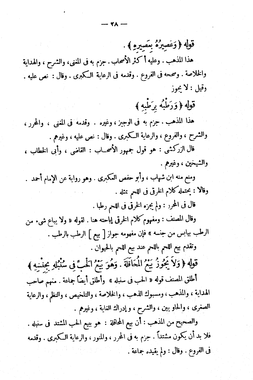 قَوْلُهُ (وَلَا يَجُوزُ بَيْعُ الْمُحَاقَلَةِ. وَهُوَ بَيْعُ الْحَبِّ فِي سُنْبُلِهِ بِجِنْسِهِ) . أَطْلَقَ الْمُصَنِّفُ قَوْلَهُ " الْحَبُّ فِي سُنْبُلِهِ " وَأَطْلَقَ أَيْضًا جَمَاعَةٌ. مِنْهُمْ صَاحِبُ الْهِدَايَةِ، وَالْمُذْهَبِ، وَمَسْبُوكِ الذَّهَبِ، وَالْخُلَاصَةِ، وَالتَّلْخِيصِ، وَالنَّظْمِ، وَالرِّعَايَةِ الصُّغْرَى، وَالْحَاوِيَيْنِ، وَالشَّرْحِ، وَإِدْرَاكِ الْغَايَةِ، وَغَيْرِهِمْ. وَالصَّحِيحُ مِنْ الْمَذْهَبِ: أَنَّ بَيْعَ الْمُحَاقَلَةِ: هُوَ بَيْعُ الْحَبِّ الْمُشْتَدِّ فِي سُنْبُلِهِ. فَلَا بُدَّ أَنْ يَكُونَ مُشْتَدًّا. جَزَمَ بِهِ فِي الْمُحَرَّرِ، وَالْمُنَوِّرِ، وَالرِّعَايَةِ الْكُبْرَى. وَقَدَّمَهُ فِي الْفُرُوعِ. وَقَالَ: وَلَمْ يُقَيِّدْهُ جَمَاعَةٌ.