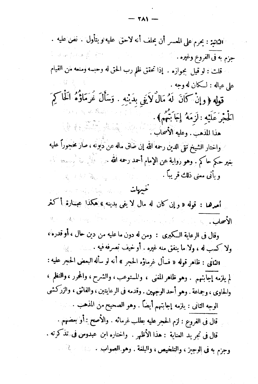 أَحَدُهُمَا: قَوْلُهُ " وَإِنْ كَانَ لَهُ مَالٌ لَا يَفِي بِدَيْنِهِ " هَكَذَا عِبَارَةُ أَكْثَرِ الْأَصْحَابِ. وَقَالَ فِي الرِّعَايَةِ الْكُبْرَى: وَمَنْ لَهُ دُونَ مَا عَلَيْهِ مِنْ دَيْنٍ حَالٍّ، أَوْ قَدْرِهِ، وَلَا كَسْبَ لَهُ، وَلَا مَا يُنْفِقُ مِنْهُ غَيْرُهُ. أَوْ خِيفَ تَصَرُّفُهُ فِيهِ.