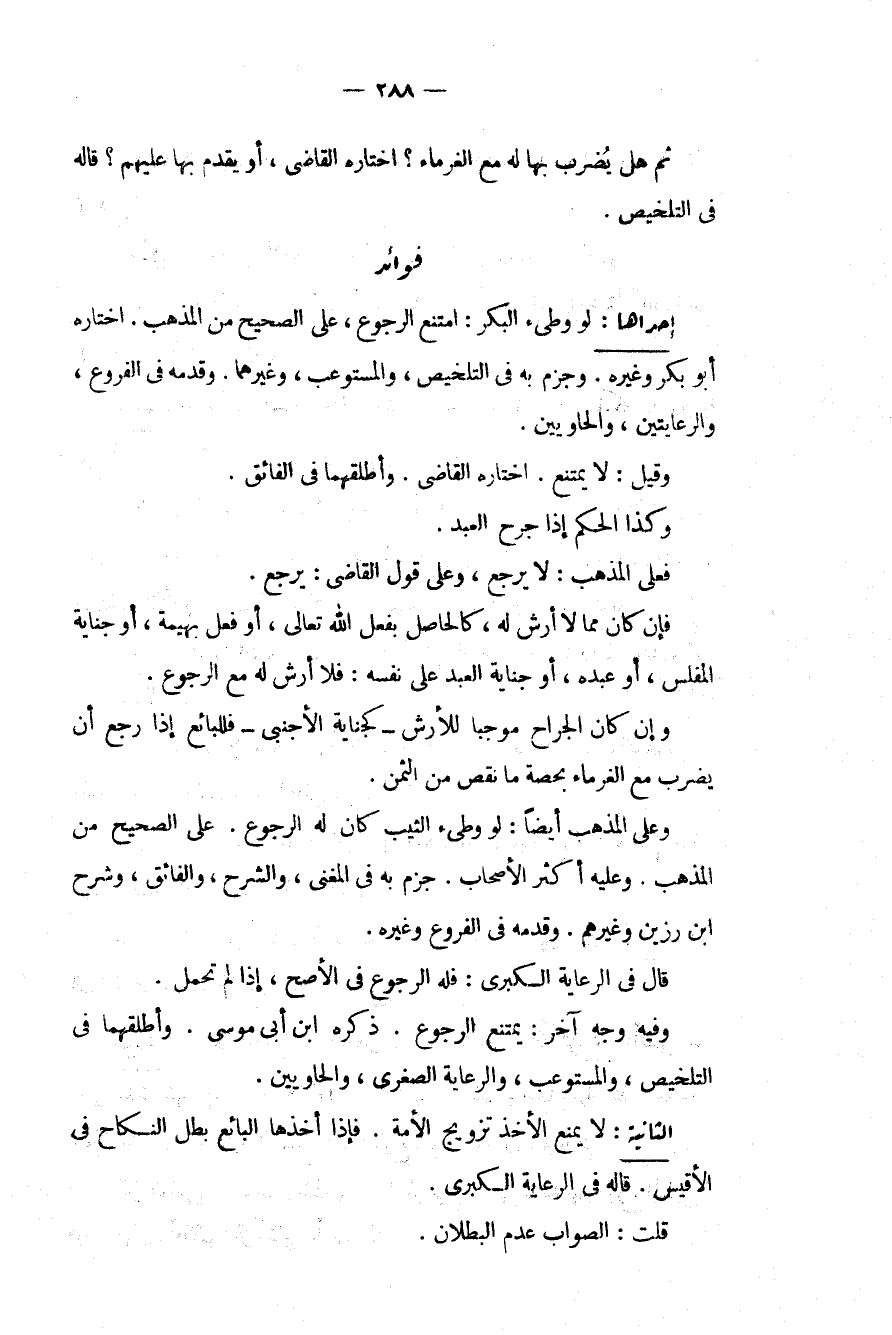 إحْدَاهُمَا: لَوْ وَطِئَ الْبِكْرَ: امْتَنَعَ الرُّجُوعُ، عَلَى الصَّحِيحِ مِنْ الْمَذْهَبِ. اخْتَارَهُ أَبُو بَكْرٍ وَغَيْرُهُ. وَجَزَمَ بِهِ فِي التَّلْخِيصِ، وَالْمُسْتَوْعِبِ، وَغَيْرِهِمَا. وَقَدَّمَهُ فِي الْفُرُوعِ، وَالرِّعَايَتَيْنِ، وَالْحَاوِيَيْنِ. وَقِيلَ: لَا يَمْتَنِعُ. اخْتَارَهُ الْقَاضِي. وَأَطْلَقَهُمَا فِي الْفَائِقِ. وَكَذَا الْحُكْمُ إذَا جُرِحَ الْعَبْدُ: فَعَلَى الْمَذْهَبِ: لَا يَرْجِعُ، وَعَلَى قَوْلِ الْقَاضِي: يَرْجِعُ. فَإِنْ كَانَ مِمَّا لَا أَرْشَ لَهُ، كَالْحَاصِلِ بِفِعْلِ اللَّهِ تَعَالَى، أَوْ فِعْلِ بَهِيمَةٍ، أَوْ جِنَايَةِ الْمُفْلِسِ، أَوْ عَبْدِهِ، أَوْ جِنَايَةِ الْعَبْدِ عَلَى نَفْسِهِ: فَلَا أَرْشَ لَهُ مَعَ الرُّجُوعِ. وَإِنْ كَانَ الْجِرَاحُ مُوجِبًا لِلْأَرْشِ كَجِنَايَةِ الْأَجْنَبِيِّ فَلِلْبَائِعِ إذَا رَجَعَ أَنْ يَضْرِبَ مَعَ الْغُرَمَاءِ بِحِصَّةِ مَا نَقَصَ مِنْ الثَّمَنِ. وَعَلَى الْمَذْهَبِ أَيْضًا: لَوْ وَطِئَ الثَّيِّبَ كَانَ لَهُ الرُّجُوعُ. عَلَى الصَّحِيحِ مِنْ الْمَذْهَبِ. وَعَلَيْهِ أَكْثَرُ الْأَصْحَابِ. جَزَمَ بِهِ فِي الْمُغْنِي، وَالشَّرْحِ، وَالْفَائِقِ، وَشَرْحِ ابْنِ رَزِينٍ وَغَيْرِهِمْ. وَقَدَّمَهُ فِي الْفُرُوعِ وَغَيْرِهِ. قَالَ فِي الرِّعَايَةِ الْكُبْرَى: فَلَهُ الرُّجُوعُ فِي الْأَصَحِّ، إذَا لَمْ تَحْمِلْ. وَفِيهِ وَجْهٌ آخَرُ: يَمْتَنِعُ الرُّجُوعُ. ذَكَرَهُ ابْنُ أَبِي مُوسَى. وَأَطْلَقَهُمَا فِي التَّلْخِيصِ، وَالْمُسْتَوْعِبِ، وَالرِّعَايَةِ الصُّغْرَى، وَالْحَاوِيَيْنِ.