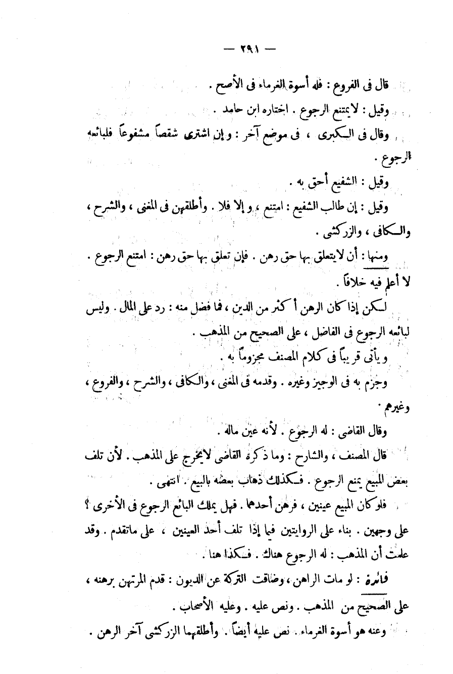 قَالَ فِي الْفُرُوعِ: فَلَهُ أُسْوَةُ الْغُرَمَاءِ فِي الْأَصَحِّ. وَقِيلَ: لَا يَمْتَنِعُ الرُّجُوعُ. اخْتَارَهُ ابْنُ حَامِدٍ. وَقَالَ فِي الْكُبْرَى، فِي مَوْضِعٍ آخَرَ: وَإِنْ اشْتَرَى شِقْصًا مَشْفُوعًا فَلِبَائِعِهِ الرُّجُوعُ. وَقِيلَ: الشَّفِيعُ أَحَقُّ بِهِ. وَقِيلَ: إنْ طَالَبَ الشَّفِيعُ: امْتَنَعَ، وَإِلَّا فَلَا. وَأَطْلَقَهُنَّ فِي الْمُغْنِي، وَالشَّرْحِ، وَالْكَافِي، وَالزَّرْكَشِيُّ. وَمِنْهَا: أَنْ لَا يَتَعَلَّقَ بِهَا حَقُّ رَهْنٍ. فَإِنْ تَعَلَّقَ بِهَا حَقُّ رَهْنٍ: امْتَنَعَ الرُّجُوعُ. لَا أَعْلَمُ فِيهِ خِلَافًا. لَكِنْ إذَا كَانَ الرَّهْنُ أَكْثَرَ مِنْ الدَّيْنِ، فَمَا فَضَلَ مِنْهُ: رُدَّ عَلَى الْمَالِ. وَلَيْسَ لِبَائِعِهِ الرُّجُوعُ فِي الْفَاضِلِ، عَلَى الصَّحِيحِ مِنْ الْمَذْهَبِ. وَيَأْتِي قَرِيبًا فِي كَلَامِ الْمُصَنِّفِ مَجْزُومًا بِهِ. وَجَزَمَ بِهِ فِي الْوَجِيزِ وَغَيْرِهِ. وَقَدَّمَهُ فِي الْمُغْنِي، وَالْكَافِي، وَالشَّرْحِ، وَالْفُرُوعِ، وَغَيْرِهِمْ. وَقَالَ الْقَاضِي: لَهُ الرُّجُوعُ؛ لِأَنَّهُ عَيْنُ مَالِهِ. قَالَ الْمُصَنِّفُ، وَالشَّارِحُ: وَمَا ذَكَرَهُ الْقَاضِي لَا يُخَرَّجُ عَلَى الْمَذْهَبِ؛ لِأَنَّ تَلَفَ بَعْضِ الْمَبِيعِ يَمْنَعُ الرُّجُوعَ. فَكَذَلِكَ ذَهَابُ بَعْضِهِ بِالْبَيْعِ. انْتَهَى.