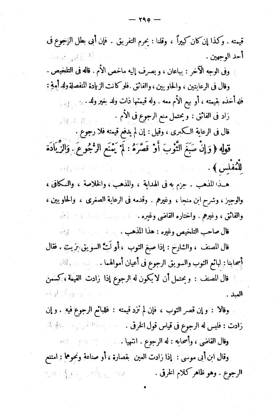 قِيمَتِهِ. وَكَذَا إنْ كَانَ كَبِيرًا، وَقُلْنَا: يَحْرُمُ التَّفْرِيقُ. فَإِنْ أَبَى بَطَلَ الرُّجُوعُ فِي أَحَدِ الْوَجْهَيْنِ. وَفِي الْوَجْهِ الْآخَرِ: يُبَاعَانِ، وَيُصْرَفُ إلَيْهِ مَا خَصَّ الْأُمَّ. قَالَهُ فِي التَّلْخِيصِ وَقَالَ فِي الرِّعَايَتَيْنِ، وَالْحَاوِيَيْنِ، وَالْفَائِقِ. فَلَوْ كَانَتْ الزِّيَادَةُ الْمُنْفَصِلَةُ وَلَدَ أَمَةٍ: فَلَهُ أَخْذُهُ بِقِيمَتِهِ، أَوْ بَيْعُ الْأُمِّ مَعَهُ. وَلَهُ قِيمَتُهَا ذَاتَ وَلَدٍ بِغَيْرِ وَلَدٍ. زَادَ فِي الْفَائِقِ: وَيُحْتَمَلُ مَنْعُ الرُّجُوعِ فِي الْأُمِّ. قَالَ فِي الرِّعَايَةِ الْكُبْرَى، وَقِيلَ: إنْ لَمْ يَدْفَعْ قِيمَتَهُ فَلَا رُجُوعَ.