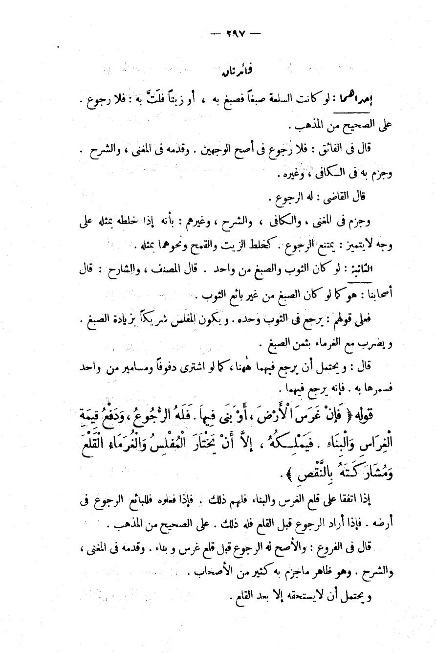 إحْدَاهُمَا: لَوْ كَانَتْ السِّلْعَةُ صَبْغًا فَصَبَغَ بِهِ، أَوْ زَيْتًا فَلَتّ بِهِ: فَلَا رُجُوعَ. عَلَى الصَّحِيحِ مِنْ الْمَذْهَبِ. قَالَ فِي الْفَائِقِ: فَلَا رُجُوعَ فِي أَصَحِّ الْوَجْهَيْنِ. وَقَدَّمَهُ فِي الْمُغْنِي، وَالشَّرْحِ. وَجَزَمَ بِهِ فِي الْكَافِي، وَغَيْرِهِ. قَالَ الْقَاضِي: لَهُ الرُّجُوعُ. وَجَزَمَ فِي الْمُغْنِي، وَالْكَافِي، وَالشَّرْحِ، وَغَيْرِهِمْ: بِأَنَّهُ إذَا خَلَطَهُ بِمِثْلِهِ عَلَى وَجْهٍ لَا يَتَمَيَّزُ: يَمْتَنِعُ الرُّجُوعُ. كَخَلْطِ الزَّيْتِ وَالْقَمْحِ وَنَحْوِهِمَا بِمِثْلِهِ.