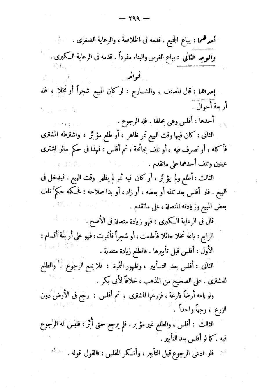 إحْدَاهَا: قَالَ الْمُصَنِّفُ، وَالشَّارِحُ: لَوْ كَانَ الْمَبِيعُ شَجَرًا أَوْ نَخْلًا، فَلَهُ أَرْبَعَةُ أَحْوَالٍ:
