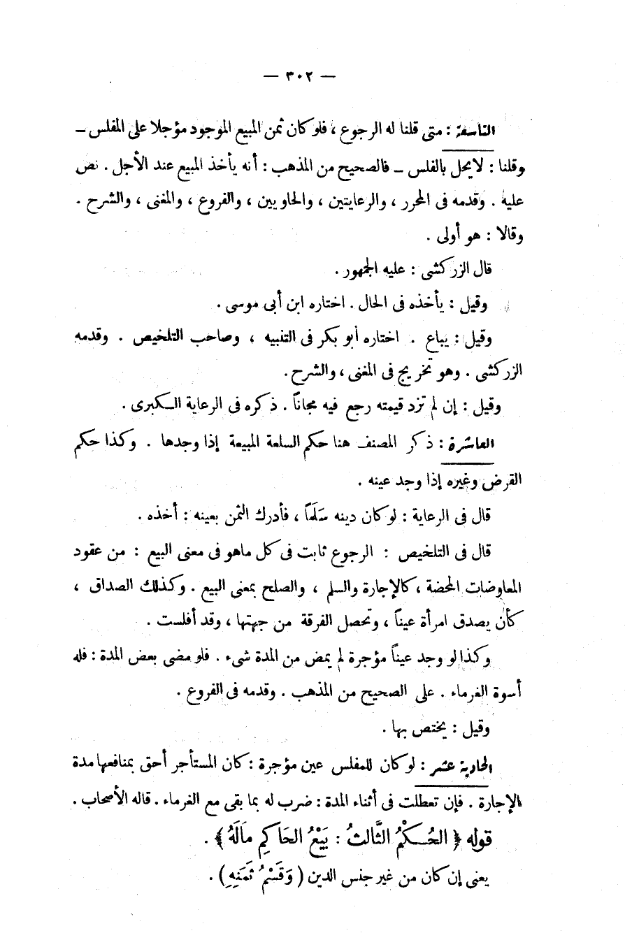 التَّاسِعَةُ: مَتَى قُلْنَا لَهُ الرُّجُوعُ، فَلَوْ كَانَ ثَمَنُ الْمَبِيعِ الْمَوْجُودِ مُؤَجَّلًا عَلَى الْمُفْلِسِ وَقُلْنَا: لَا يَحِلُّ بِالْفَلَسِ فَالصَّحِيحُ مِنْ الْمَذْهَبِ: أَنَّهُ يَأْخُذُ الْمَبِيعَ عِنْدَ الْأَجَلِ. نَصَّ عَلَيْهِ. وَقَدَّمَهُ فِي الْمُحَرَّرِ، وَالرِّعَايَتَيْنِ، وَالْحَاوِيَيْنِ، وَالْفُرُوعِ، وَالْمُغْنِي، وَالشَّرْحِ وَقَالَا: هُوَ أَوْلَى. قَالَ الزَّرْكَشِيُّ: عَلَيْهِ الْجُمْهُورُ. وَقِيلَ: يَأْخُذُهُ فِي الْحَالِ. اخْتَارَهُ ابْنُ أَبِي مُوسَى. وَقِيلَ: يُبَاعُ. اخْتَارَهُ أَبُو بَكْرٍ فِي التَّنْبِيهِ، وَصَاحِبُ التَّلْخِيصِ. وَقَدَّمَهُ الزَّرْكَشِيُّ. وَهُوَ تَخْرِيجٌ فِي الْمُغْنِي، وَالشَّرْحِ. وَقِيلَ: إنْ لَمْ تَزِدْ قِيمَتُهُ رَجَعَ فِيهِ مَجَّانًا. ذَكَرَهُ فِي الرِّعَايَةِ الْكُبْرَى.