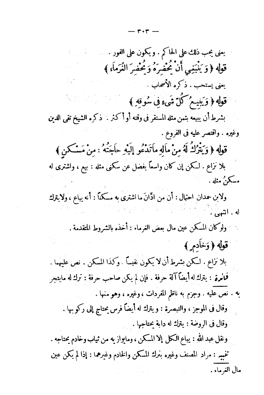 يَعْنِي يَجِبُ ذَلِكَ عَلَى الْحَاكِمِ. وَيَكُونُ عَلَى الْفَوْرِ. قَوْلُهُ (وَيَنْبَغِي أَنْ يُحْضِرَهُ وَيَحْضُرَ الْغُرَمَاءُ) يَعْنِي يُسْتَحَبُّ. ذَكَرَهُ الْأَصْحَابُ قَوْلُهُ (وَيَبِيعُ كُلُّ شَيْءٍ فِي سُوقِهِ) بِشَرْطِ أَنْ يَبِيعَهُ بِثَمَنِ مِثْلِهِ الْمُسْتَقِرِّ فِي وَقْتِهِ أَوْ أَكْثَرَ. ذَكَرَهُ الشَّيْخُ تَقِيُّ الدِّينِ وَغَيْرُهُ. وَاقْتَصَرَ عَلَيْهِ فِي الْفُرُوعِ. قَوْلُهُ (وَيُتْرَكُ لَهُ مِنْ مَالِهِ مَا تَدْعُو إلَيْهِ حَاجَتُهُ: مِنْ مَسْكَنٍ) بِلَا نِزَاعٍ. لَكِنْ إنْ كَانَ وَاسِعًا يَفْضُلُ عَنْ سُكْنَى مِثْلِهِ: بَيْعَ، وَاشْتُرِيَ لَهُ مَسْكَنُ مِثْلِهِ. وَلِابْنِ حَمْدَانَ احْتِمَالٌ: أَنَّ مَنْ ادَّانَ مَا اشْتَرَى بِهِ مَسْكَنًا: أَنَّهُ يُبَاعُ، وَلَا يُتْرَكُ لَهُ. انْتَهَى.