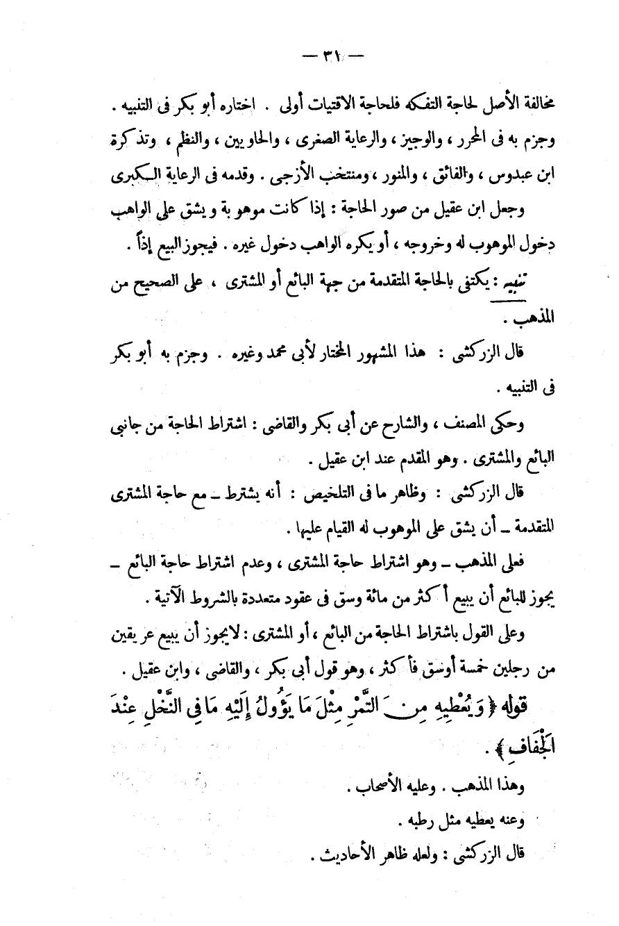 يَكْتَفِي بِالْحَاجَةِ الْمُتَقَدِّمَةِ مِنْ جِهَةِ الْبَائِعِ أَوْ الْمُشْتَرِي، عَلَى الصَّحِيحِ مِنْ الْمَذْهَبِ قَالَ الزَّرْكَشِيُّ: هَذَا الْمَشْهُورُ الْمُخْتَارُ لِأَبِي مُحَمَّدٍ وَغَيْرِهِ. وَجَزَمَ بِهِ أَبُو بَكْرٍ فِي التَّنْبِيهِ. وَحَكَى الْمُصَنِّفُ، وَالشَّارِحُ عَنْ أَبِي بَكْرٍ وَالْقَاضِي: اشْتِرَاطُ الْحَاجَةِ مِنْ جَانِبَيْ الْبَائِعِ وَالْمُشْتَرِي. وَهُوَ الْمُقَدَّمُ عِنْدَ ابْنِ عَقِيلٍ قَالَ الزَّرْكَشِيُّ: وَظَاهِرُ مَا فِي التَّلْخِيصِ: أَنَّهُ يُشْتَرَطُ مَعَ حَاجَةِ الْمُشْتَرِي الْمُتَقَدِّمَةِ أَنْ يَشُقَّ عَلَى الْمَوْهُوبِ لَهُ الْقِيَامُ عَلَيْهَا. فَعَلَى الْمَذْهَبِ وَهُوَ اشْتِرَاطُ حَاجَةِ الْمُشْتَرِي، وَعَدَمِ اشْتِرَاطِ حَاجَةِ الْبَائِعِ يَجُوزُ لِلْبَائِعِ أَنْ يَبِيعَ أَكْثَرَ مِنْ مِائَةِ وَسْقٍ فِي عُقُودٍ مُتَعَدِّدَةٍ بِالشُّرُوطِ الْآتِيَةِ. وَعَلَى الْقَوْلِ بِاشْتِرَاطِ الْحَاجَةِ مِنْ الْبَائِعِ، أَوْ الْمُشْتَرِي: لَا يَجُوزُ أَنْ يَبِيعَ عَرِيقَيْنِ مِنْ رَجُلَيْنِ خَمْسَةَ أَوْسُقٍ فَأَكْثَرَ، وَهُوَ قَوْلُ أَبِي بَكْرٍ، وَالْقَاضِي، وَابْنِ عَقِيلٍ.