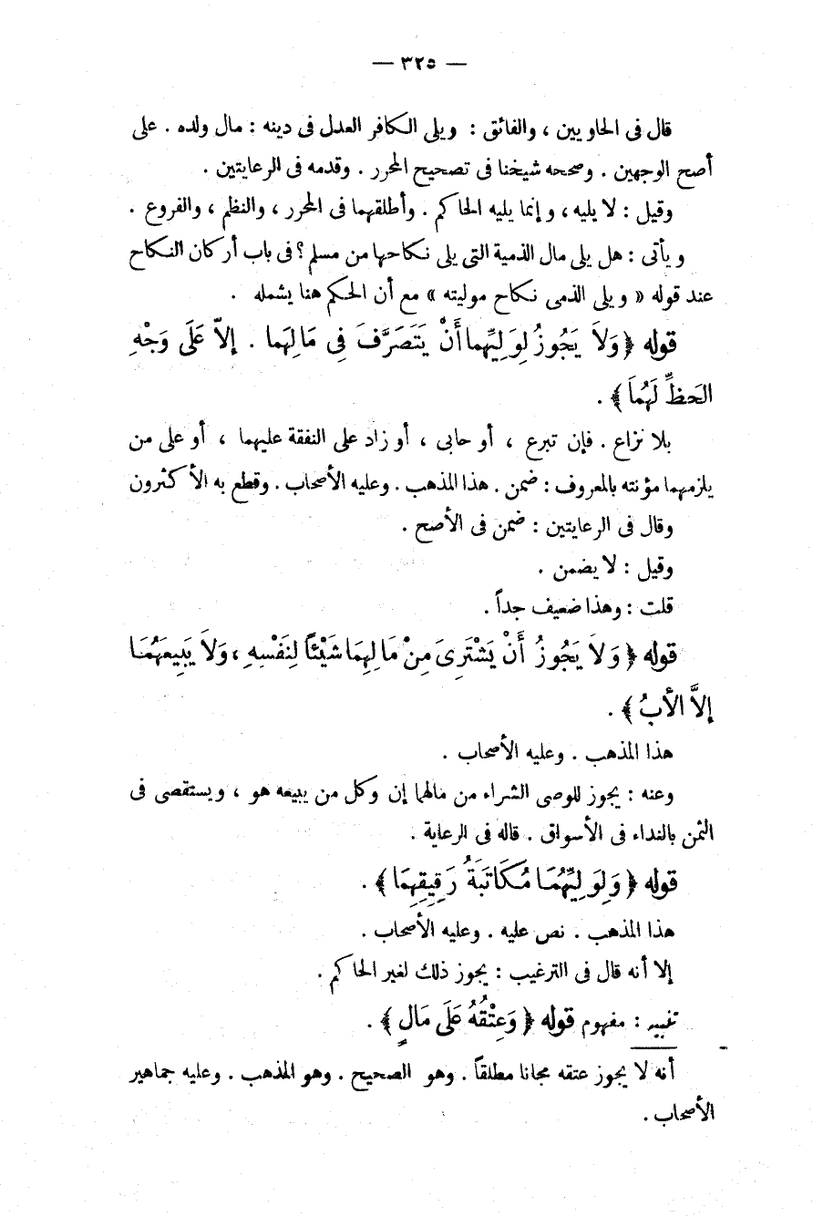 قَالَ فِي الْحَاوِيَيْنِ، وَالْفَائِقِ: وَيَلِي الْكَافِرُ الْعَدْلُ فِي دِينِهِ: مَالَ وَلَدِهِ. عَلَى أَصَحِّ الْوَجْهَيْنِ. وَصَحَّحَهُ شَيْخُنَا فِي تَصْحِيحِ الْمُحَرَّرِ. وَقَدَّمَهُ فِي الرِّعَايَتَيْنِ. وَقِيلَ: لَا يَلِيهِ، وَإِنَّمَا يَلِيهِ الْحَاكِمُ. وَأَطْلَقَهُمَا فِي الْمُحَرَّرِ، وَالنَّظْمِ، وَالْفُرُوعِ. وَيَأْتِي: هَلْ يَلِي مَالَ الذِّمِّيَّةِ الَّتِي يَلِي نِكَاحَهَا مِنْ مُسْلِمٍ؟ فِي بَابِ أَرْكَانِ النِّكَاحِ عِنْدَ قَوْلِهِ " وَيَلِي الذِّمِّيُّ نِكَاحَ مُوَلِّيَتِهِ " مَعَ أَنَّ الْحُكْمَ هُنَا يَشْمَلُهُ. قَوْلُهُ (وَلَا يَجُوزُ لِوَلِيِّهِمَا أَنْ يَتَصَرَّفَ فِي مَالِهِمَا. إلَّا عَلَى وَجْهِ الْحَظِّ لَهُمَا) . بِلَا نِزَاعٍ. فَإِنْ تَبَرَّعَ، أَوْ حَابَى، أَوْ زَادَ عَلَى النَّفَقَةِ عَلَيْهِمَا، أَوْ عَلَى مَنْ يَلْزَمُهُمَا مُؤْنَتُهُ بِالْمَعْرُوفِ: ضَمِنَ. هَذَا الْمَذْهَبُ. وَعَلَيْهِ الْأَصْحَابُ. وَقَطَعَ بِهِ الْأَكْثَرُونَ وَقَالَ فِي الرِّعَايَتَيْنِ: ضَمِنَ فِي الْأَصَحِّ. وَقِيلَ: لَا يَضْمَنُ. قُلْت: وَهَذَا ضَعِيفٌ جِدًّا.