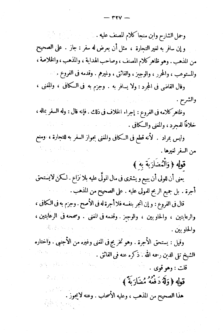 وَحَمَلَ الشَّارِحُ وَابْنُ مُنَجَّى كَلَامَ الْمُصَنِّفِ عَلَيْهِ. وَإِنْ سَافَرَ بِهِ لِغَيْرِ التِّجَارَةِ، مِثْلُ أَنْ يَعْرِضَ لَهُ سَفَرٌ: جَازَ عَلَى الصَّحِيحِ مِنْ الْمَذْهَبِ. وَهُوَ ظَاهِرُ كَلَامِ الْمُصَنِّفِ، وَصَاحِبِ الْهِدَايَةِ، وَالْمُذْهَبِ، وَالْخُلَاصَةِ وَالْمُسْتَوْعِبِ، وَالْمُحَرَّرِ، وَالْوَجِيزِ، وَالْفَائِقِ، وَغَيْرِهِمْ. وَقَدَّمَهُ فِي الْفُرُوعِ. وَقَالَ الْقَاضِي فِي الْمُجَرَّدِ: وَلَا يُسَافِرُ بِهِ. وَجَزَمَ بِهِ فِي الْكَافِي، وَالْمُغْنِي، وَالشَّرْحِ. وَظَاهِرُ كَلَامِهِ فِي الْفُرُوعِ: إجْرَاءُ الْخِلَافِ فِي ذَلِكَ. فَإِنَّهُ قَالَ: وَلَهُ السَّفَرُ بِمَالِهِ، خِلَافًا لِلْمُجَرَّدِ، وَالْمُغْنِي وَالْكَافِي. وَلَيْسَ بِمُرَادٍ؛ لِأَنَّهُ قَطَعَ فِي الْكَافِي وَالْمُغْنِي بِجَوَازِ السَّفَرِ بِهِ لِلتِّجَارَةِ، وَمُنِعَ مِنْ السَّفَرِ لِغَيْرِهَا.
